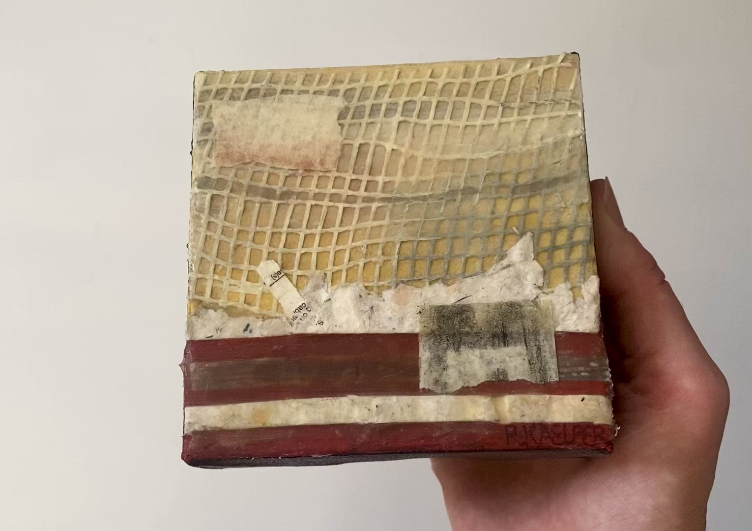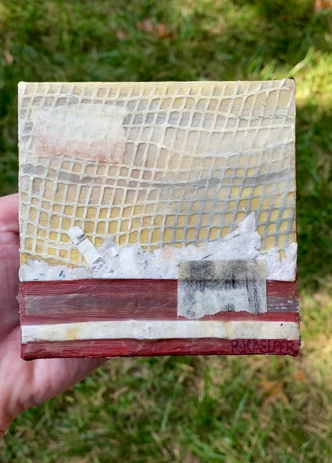 Medium: Acrylic, plastic netting, handmade paper, and graphite on stretched canvas.