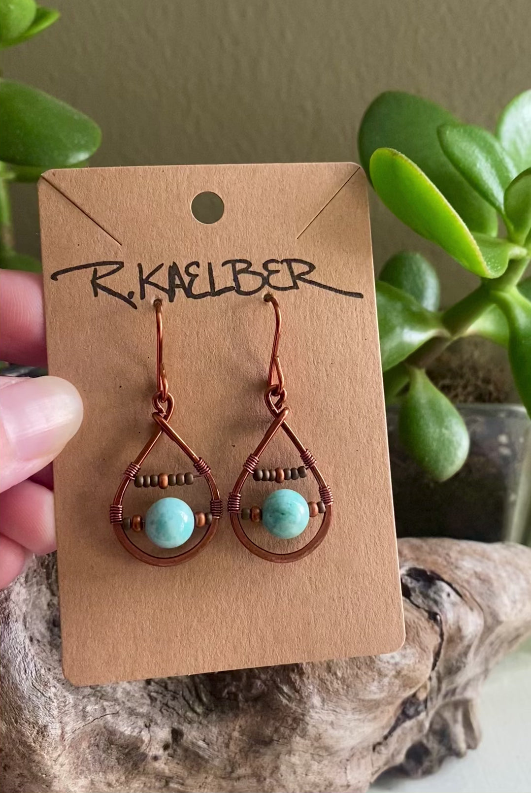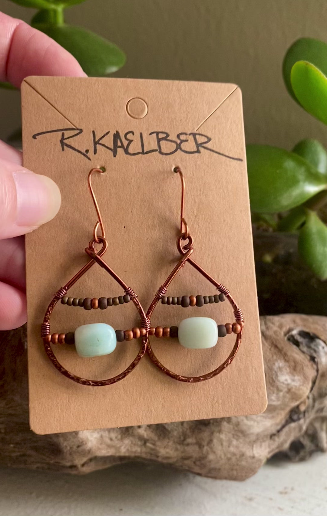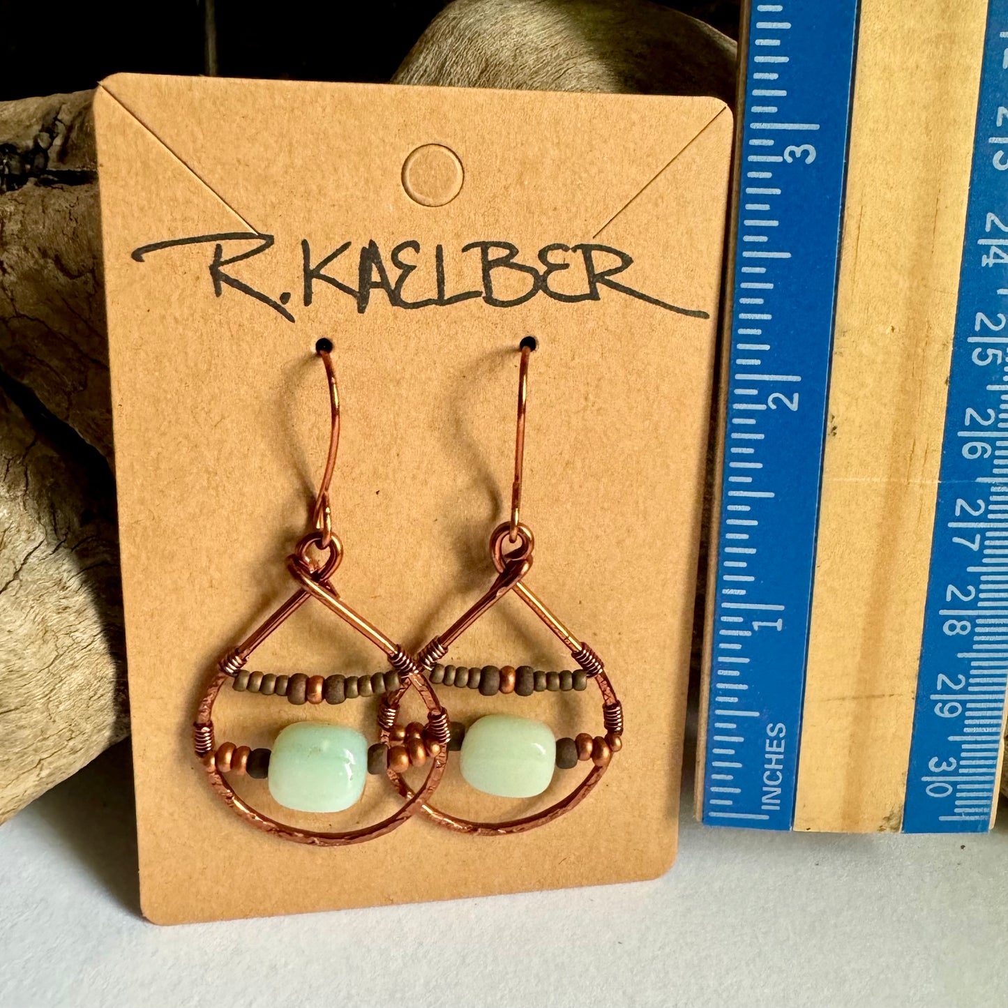 Teardrop shaped Earrings with Amazonite, seedbeads, and copper.