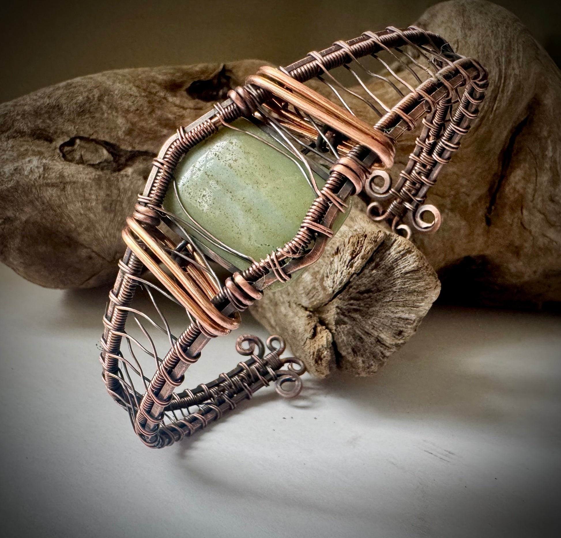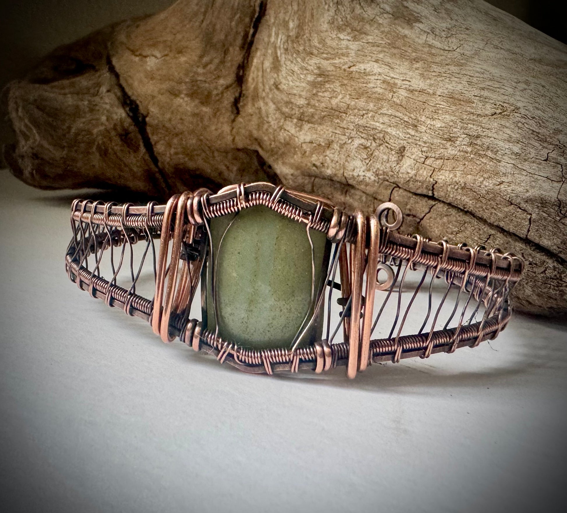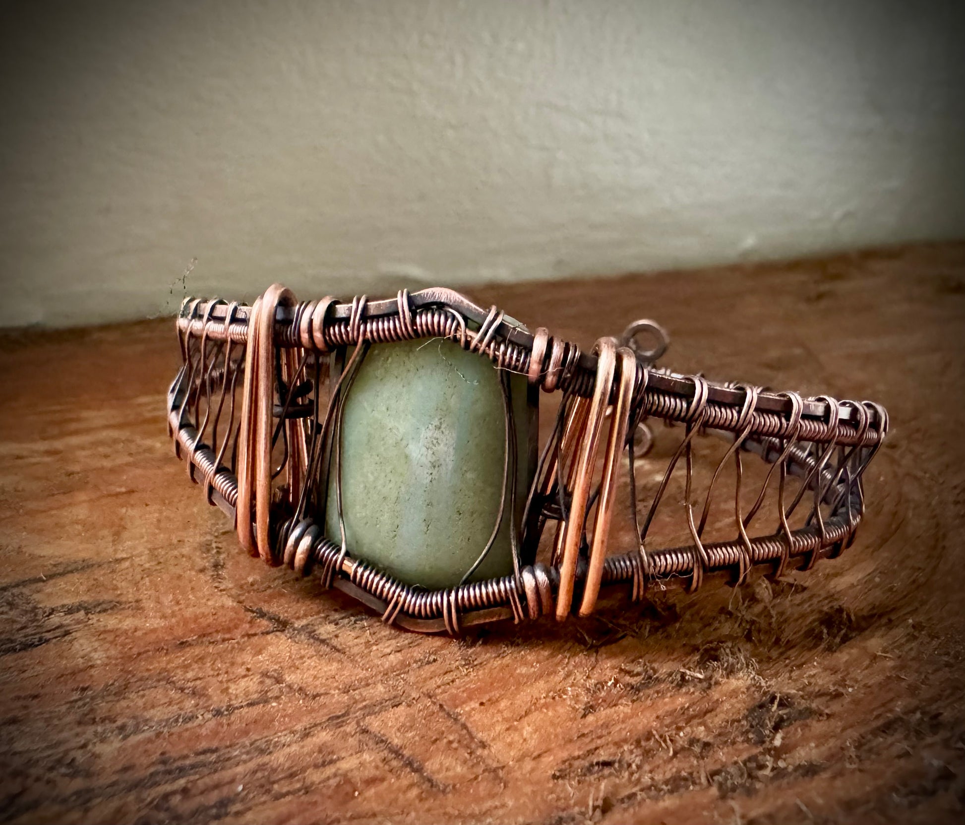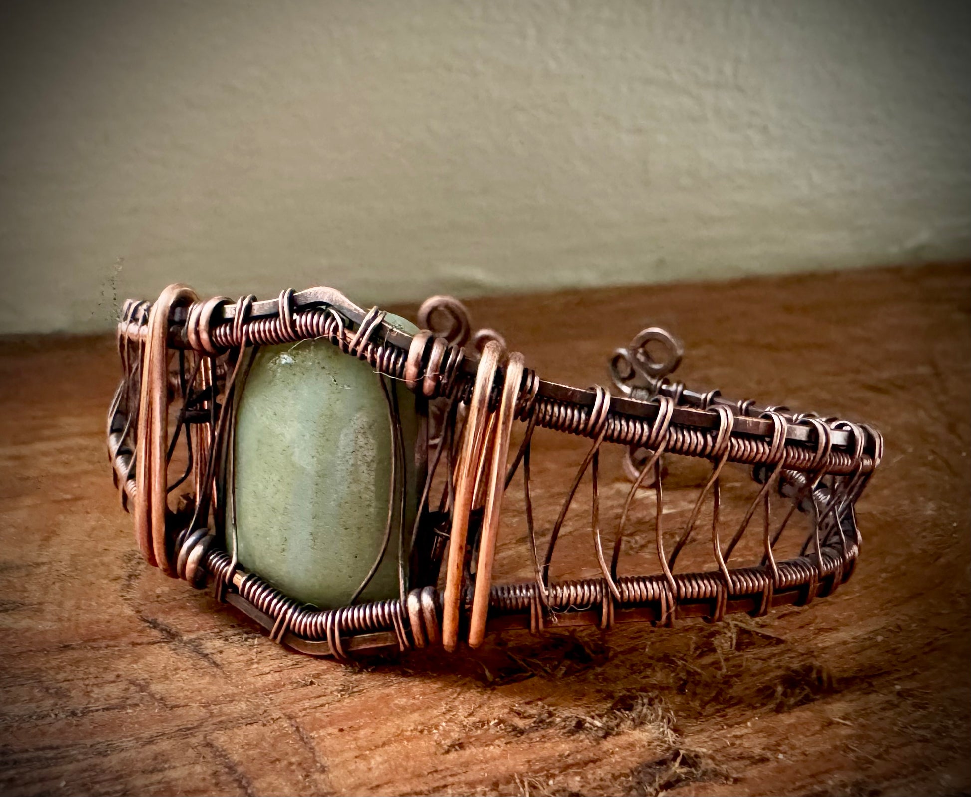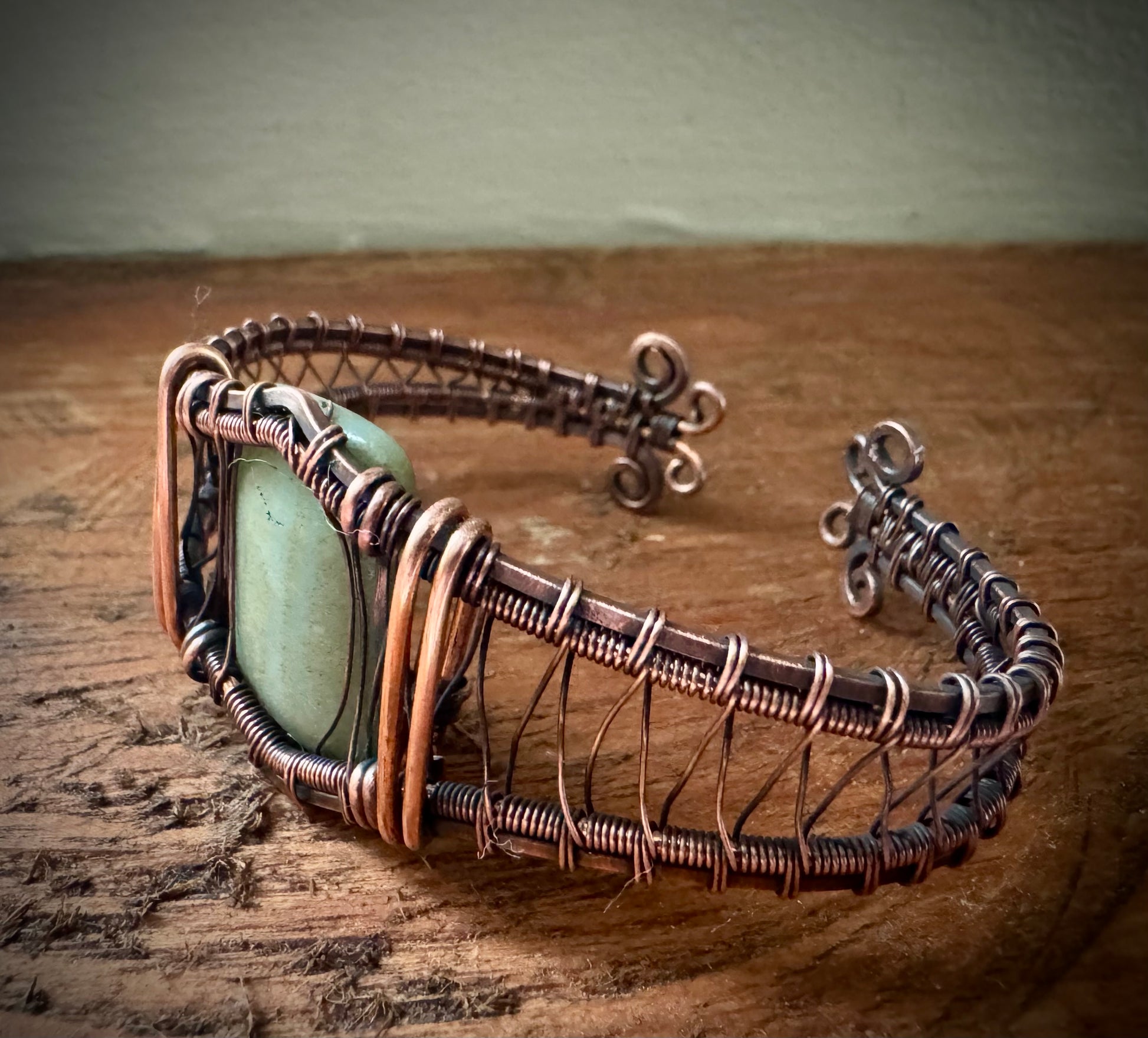 Handcrafted with copper, this cuff is a unique addition to any jewelry collection. The copper has been patinated with liver of sulfur to add to the antique look. The intricate wire wrapping technique creates a zig-zag design that adds depth and dimension to the piece. A perfect statement piece for those who appreciate vintage-inspired jewelry.