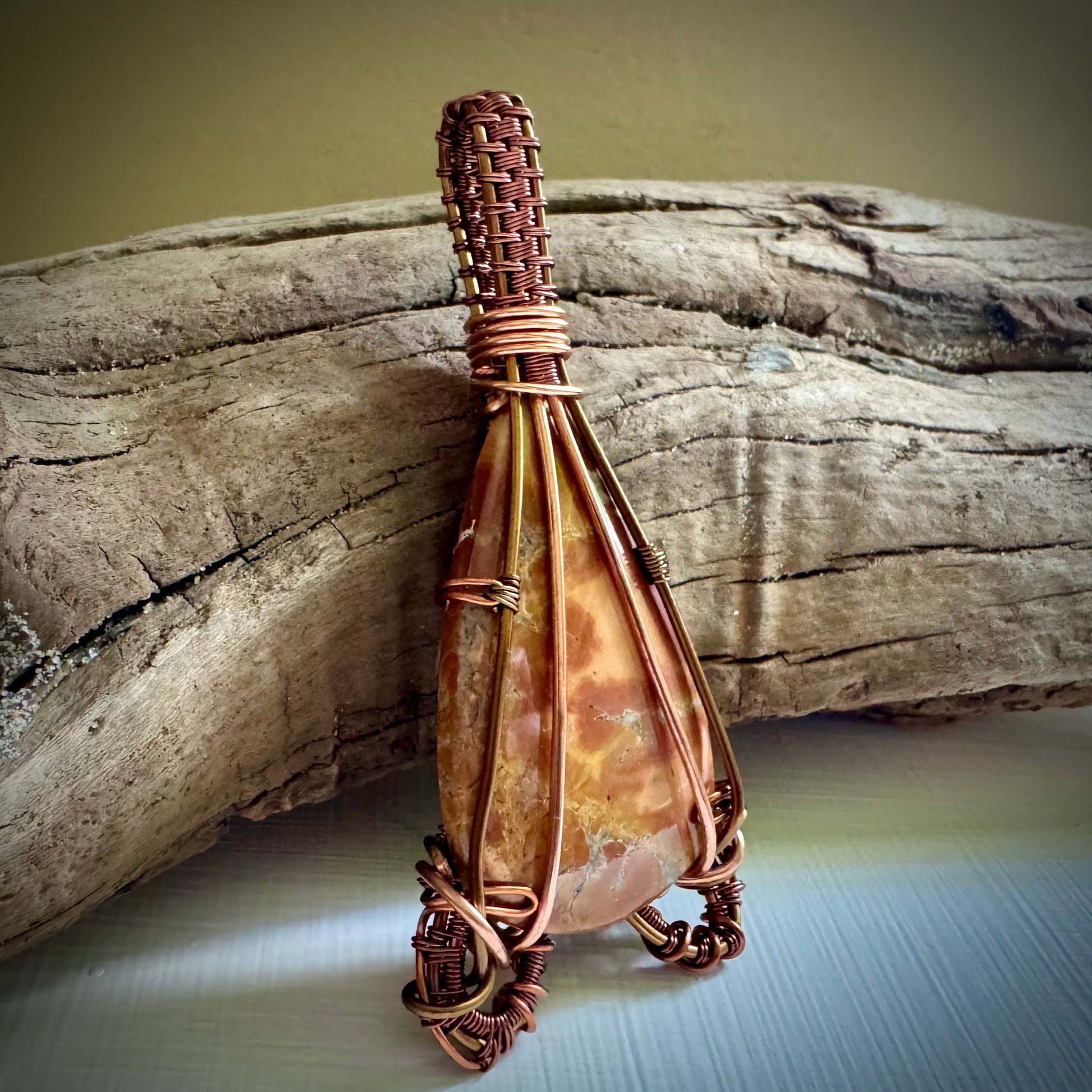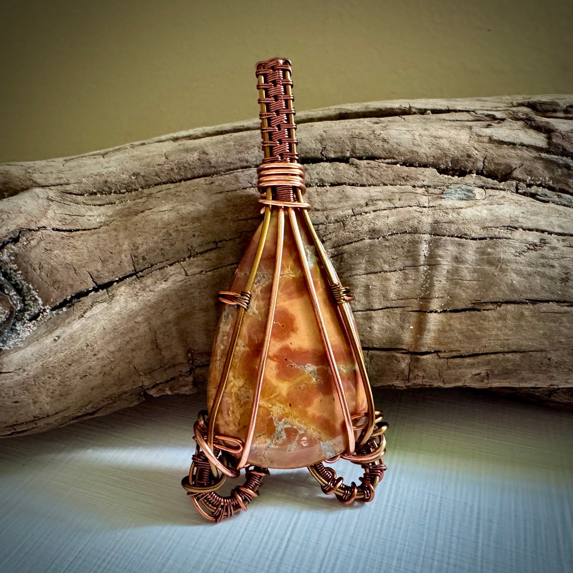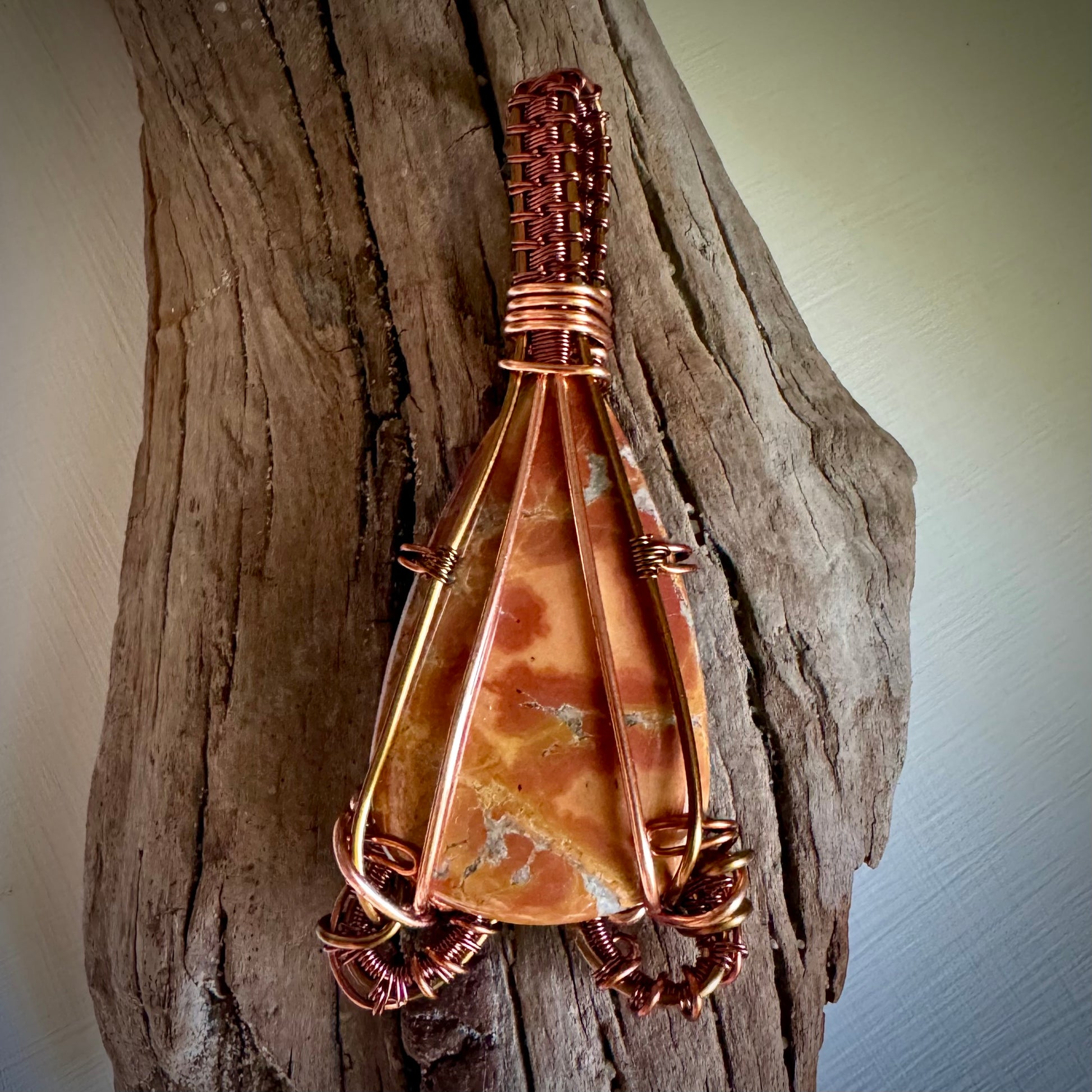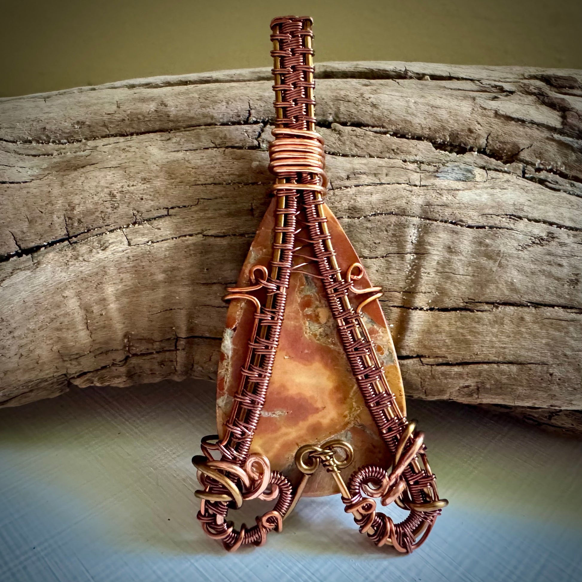 Copper and antique bronze wire wrapped pendant with Jasper stone.