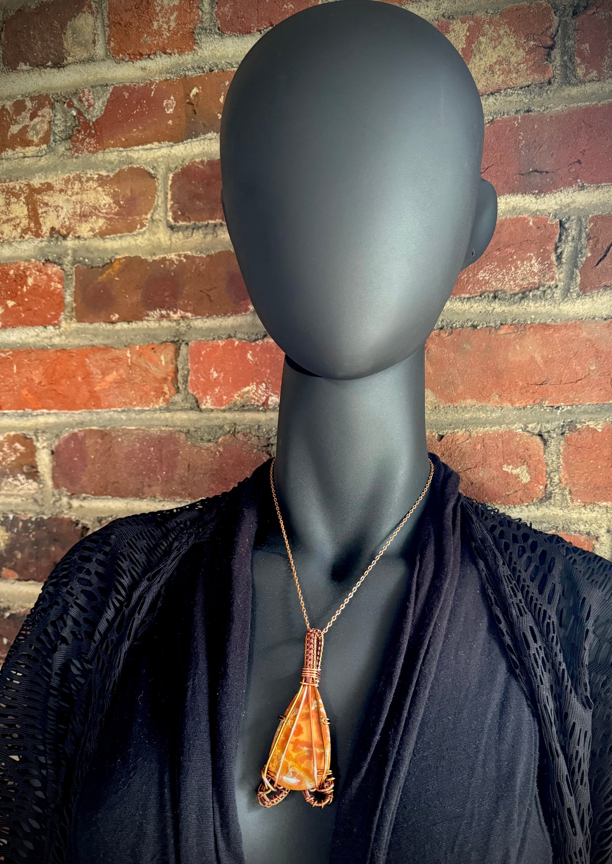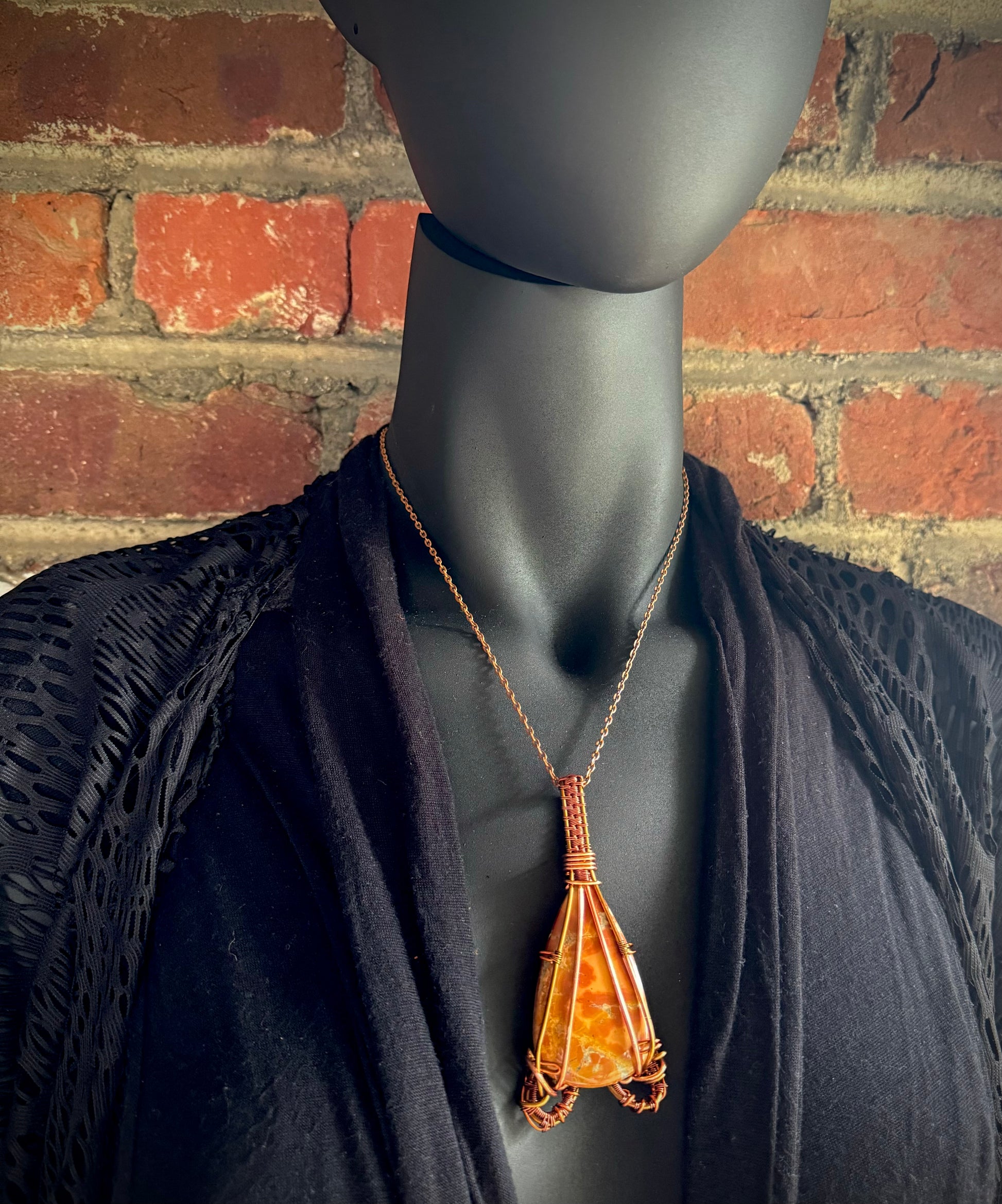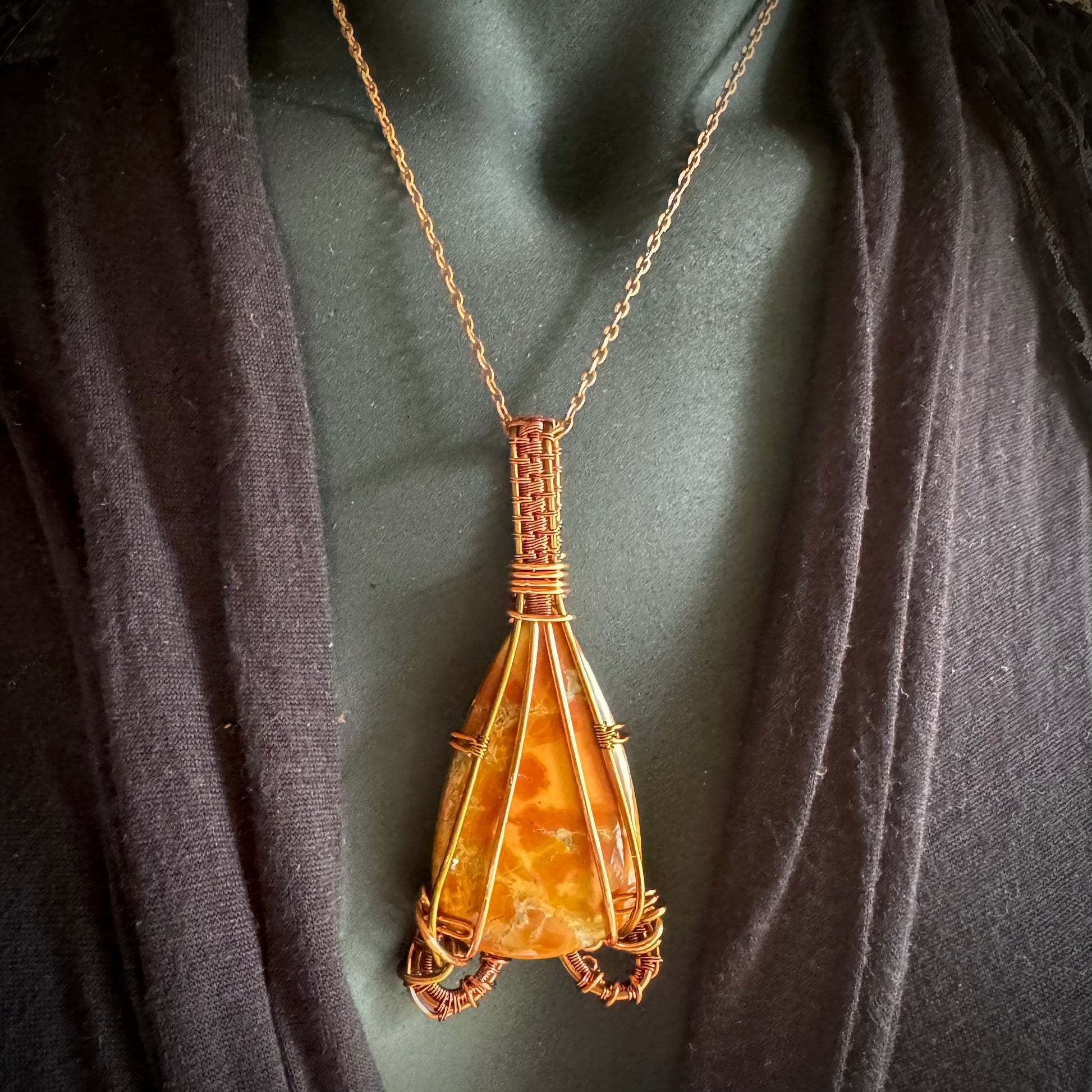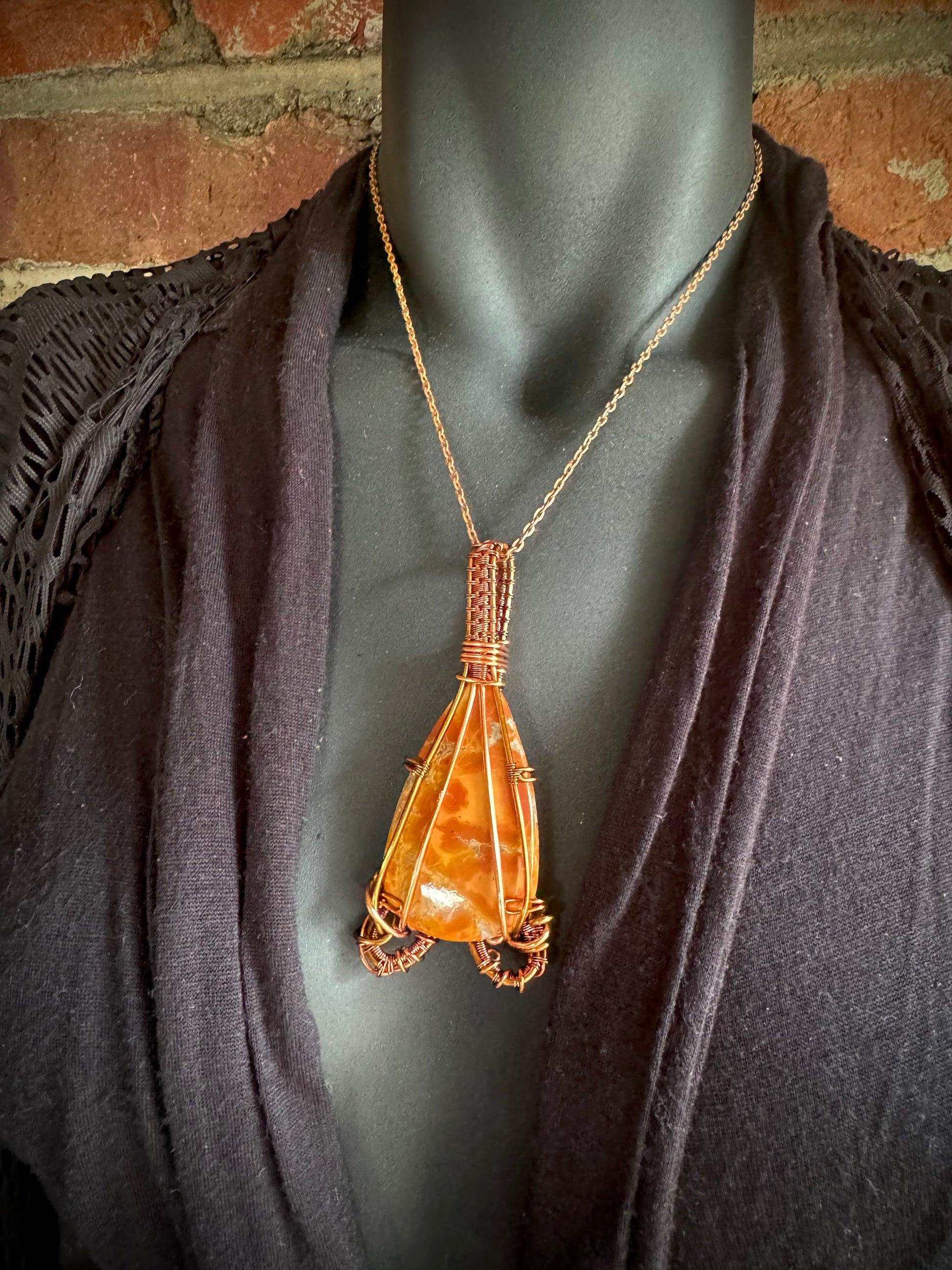 Copper and antique bronze wire wrapped pendant with Jasper stone.
