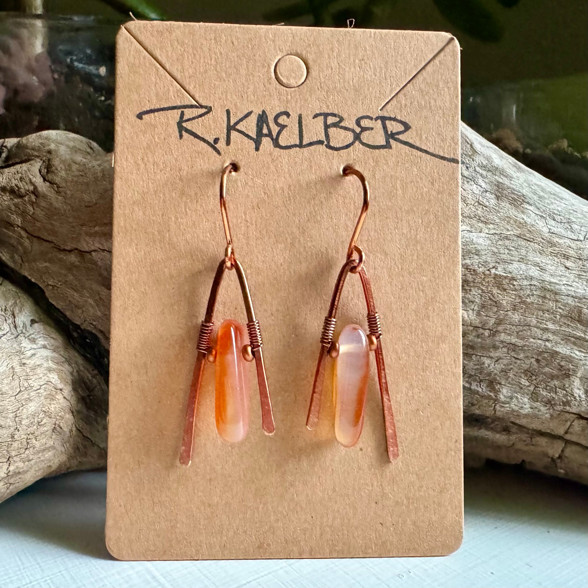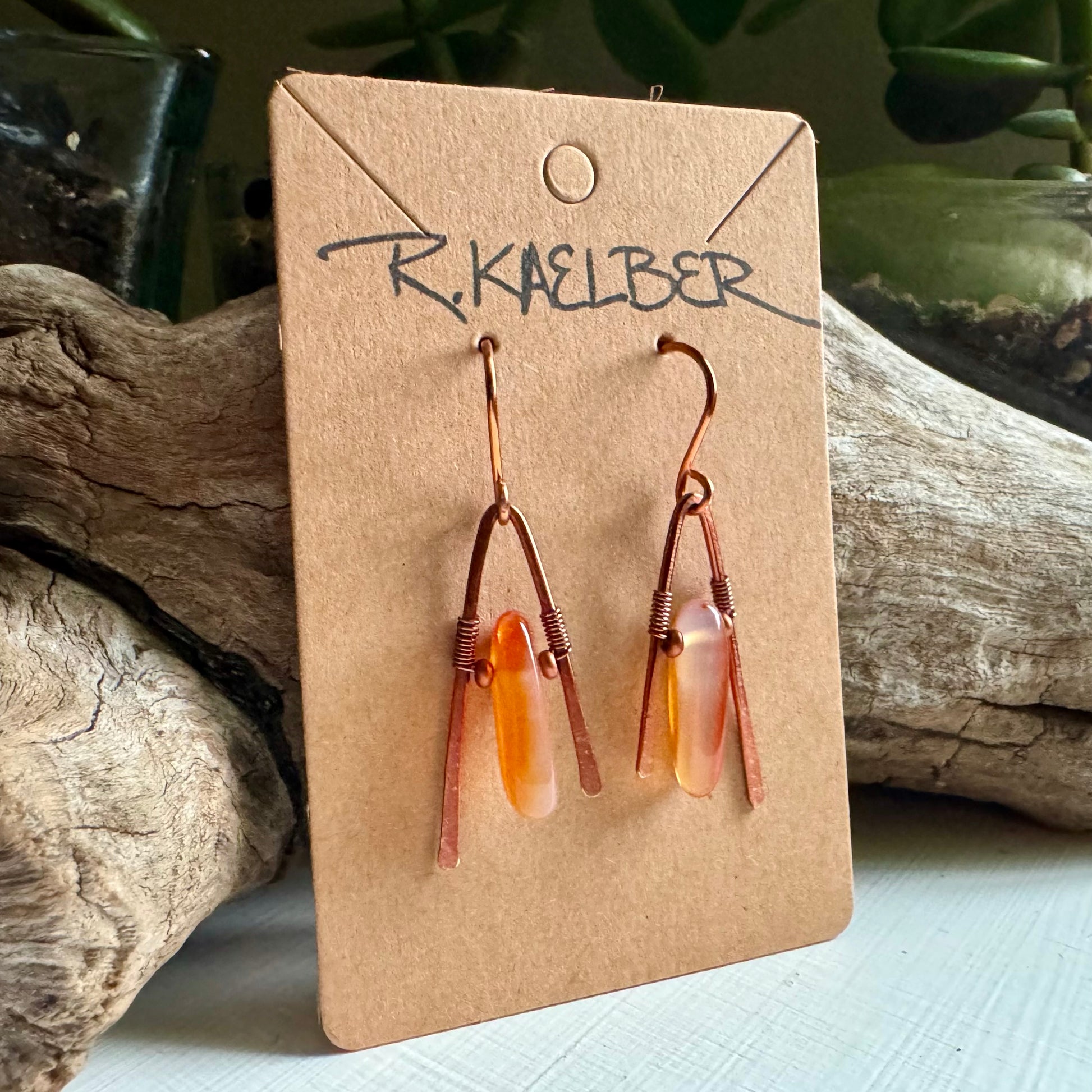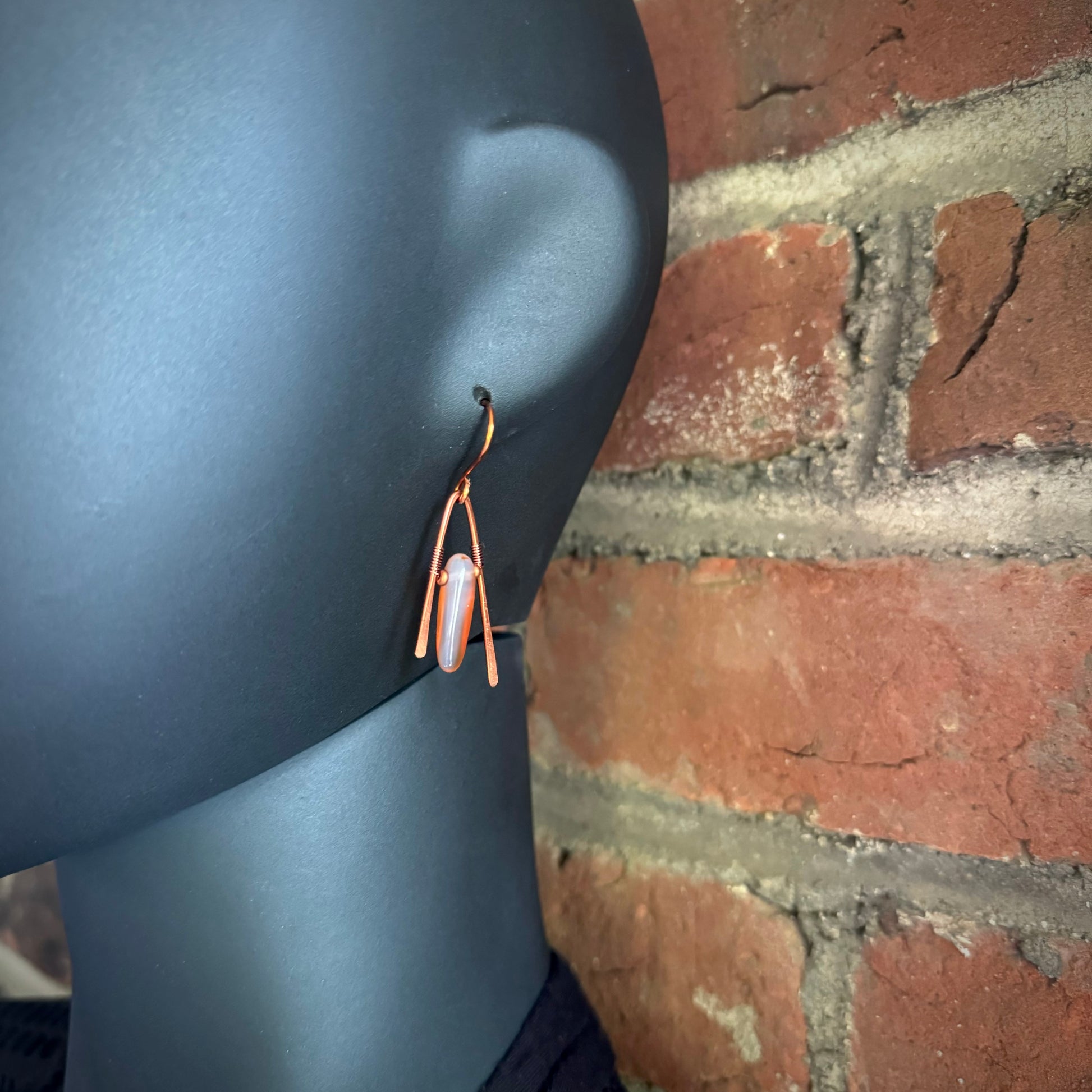 Carnelian and hammered copper A-frame earrings. Carnelian is known to help with enhancing creativity, releases stress and trauma, and is an overall warming and repairing stone.