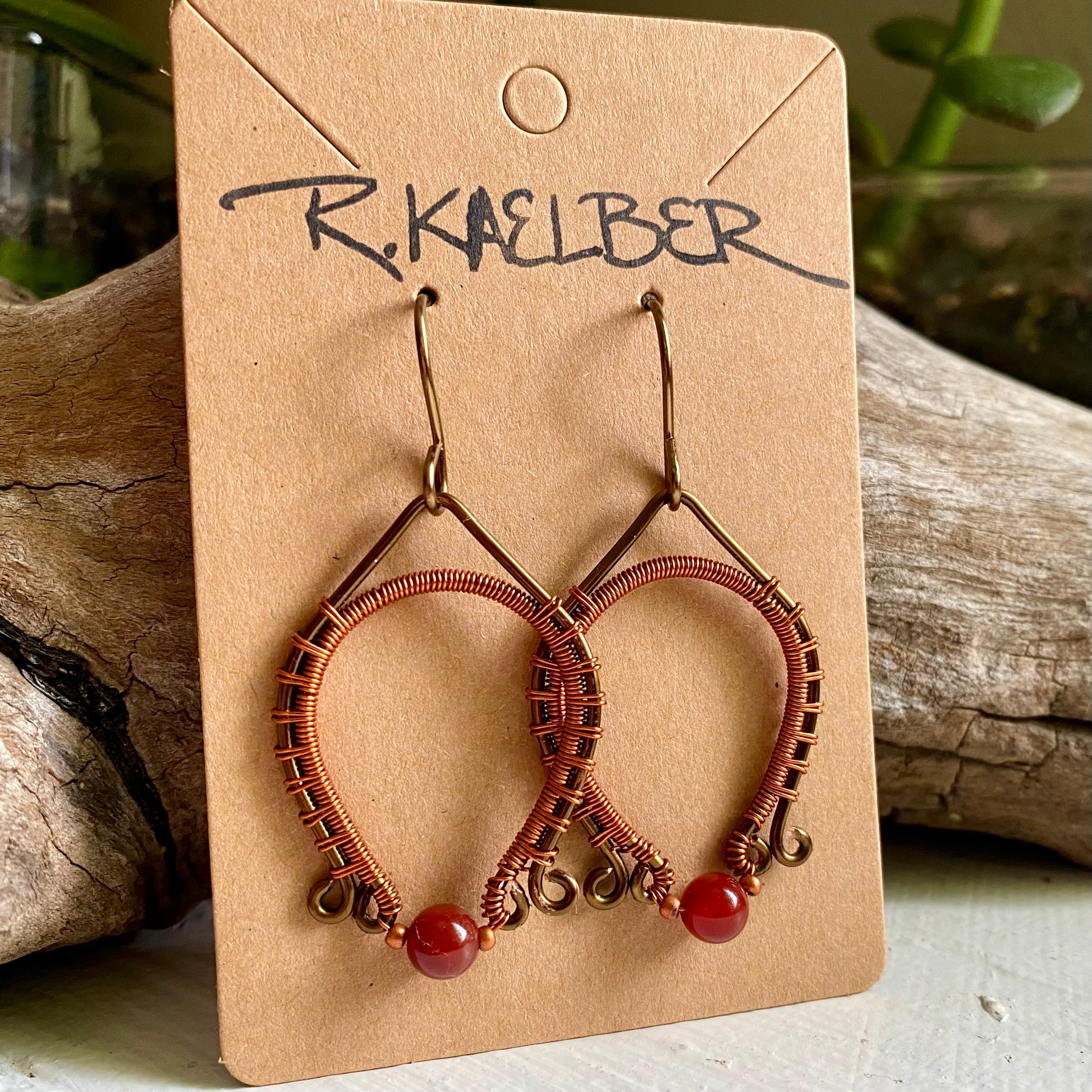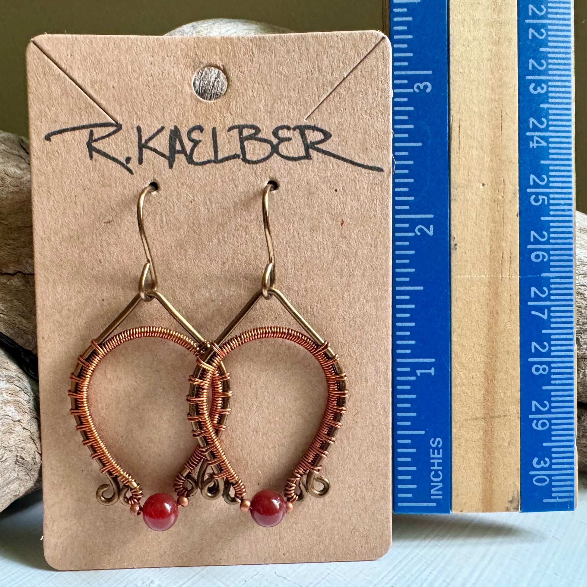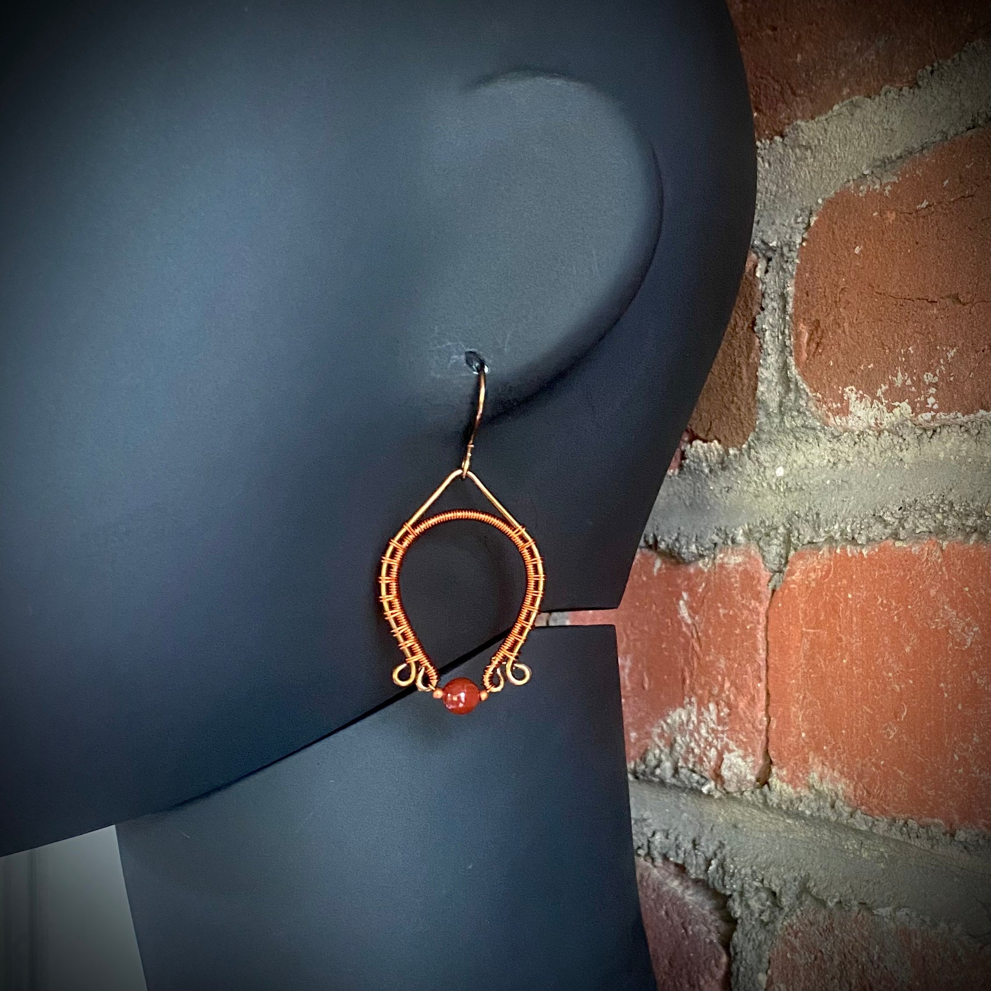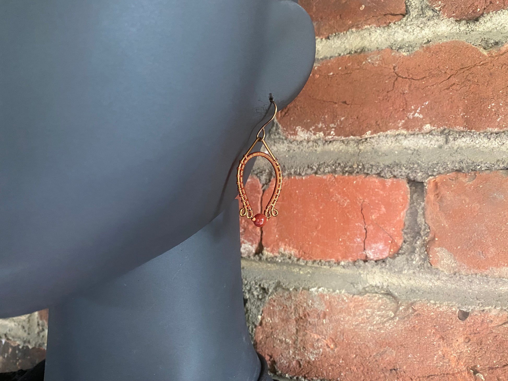 Discover the healing properties of Carnelian, Copper and antique bronze with our unique wire wrapped dangle earrings. The wire wrapped copper design brings a touch of elegance, while Carnelian releases stress and enhances creativity. Let Copper reduce inflammation and promote healing for a truly beneficial accessory.