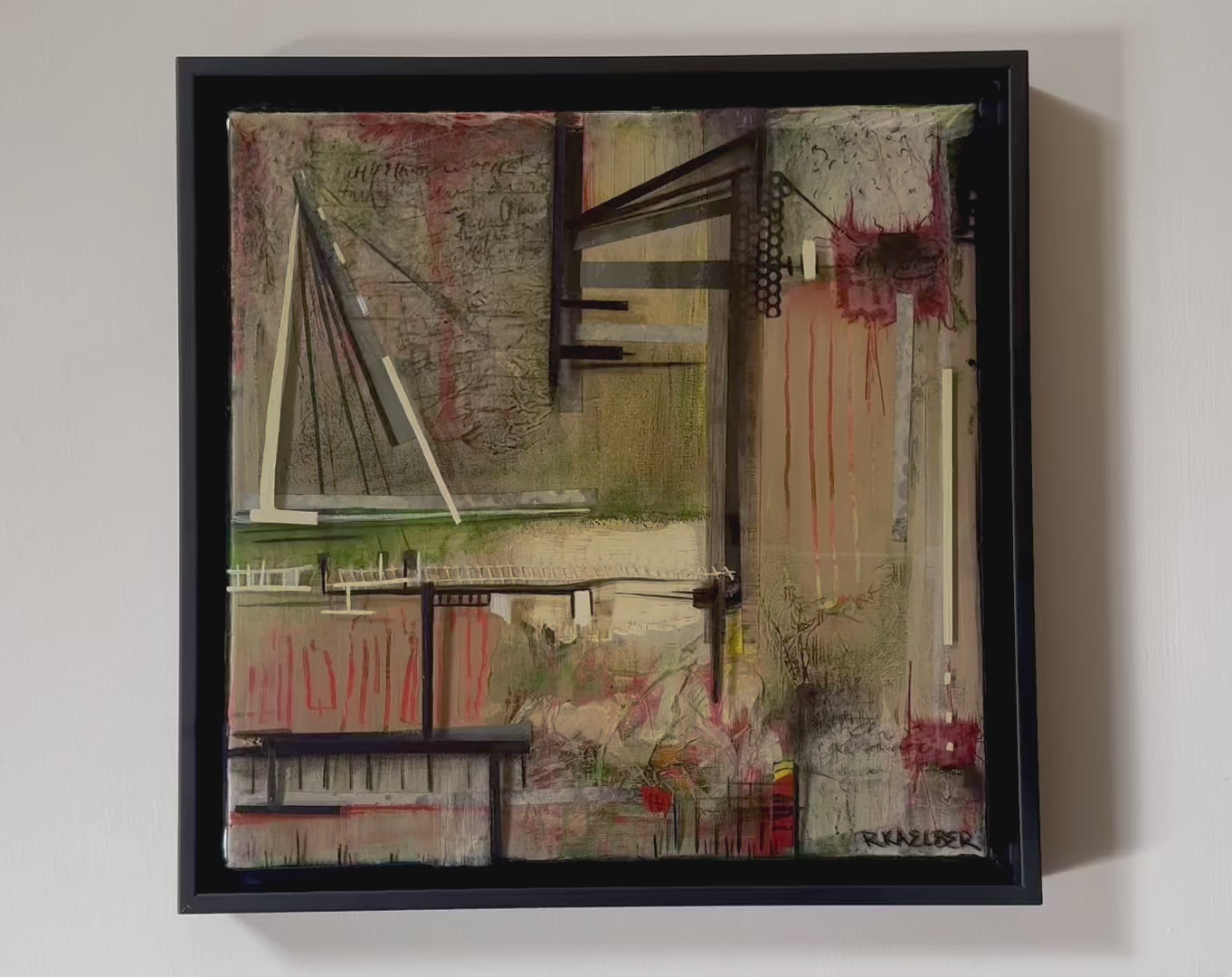Medium: Acrylic, graphite, ink, fabric, oil pastel, paper, and resin on stretched canvas.