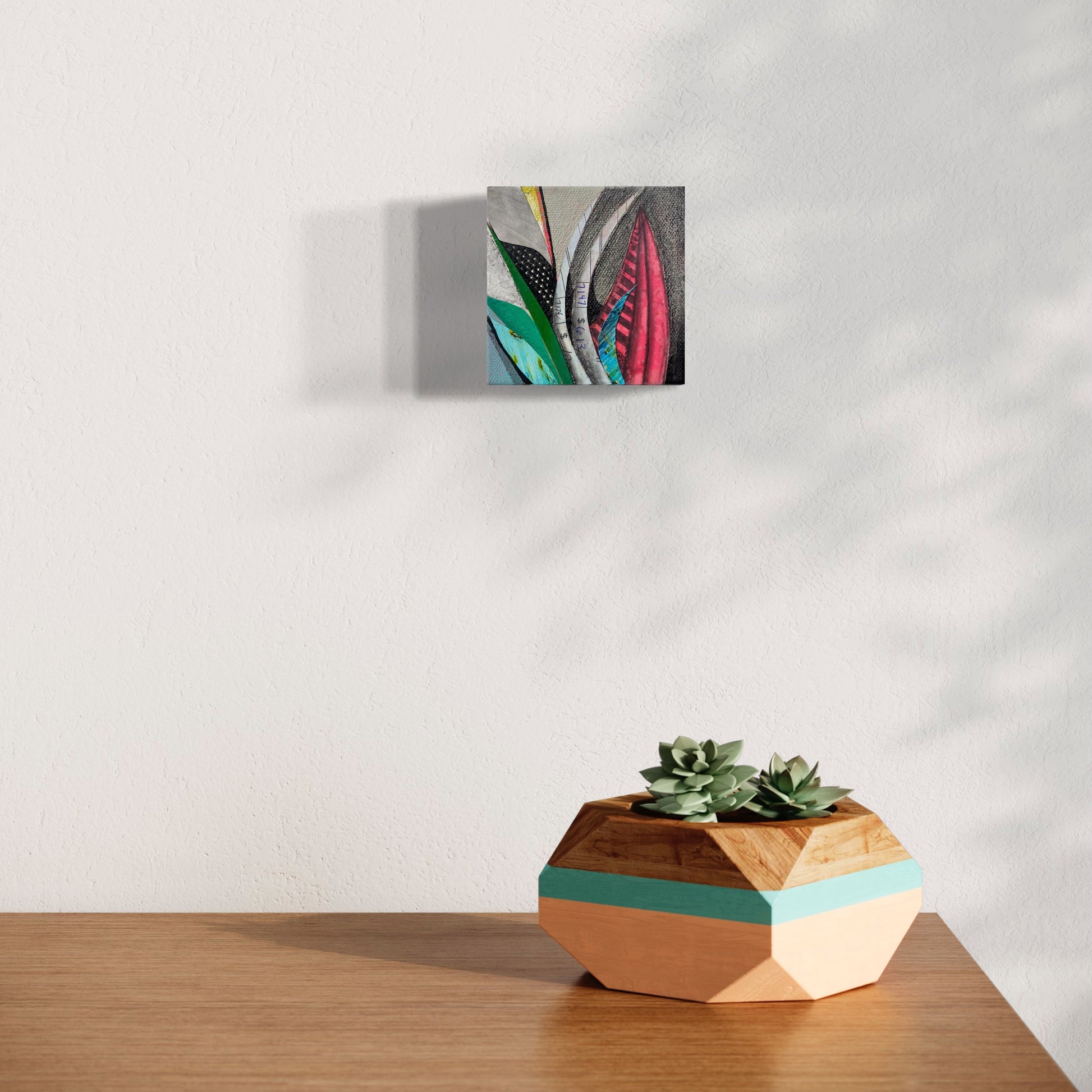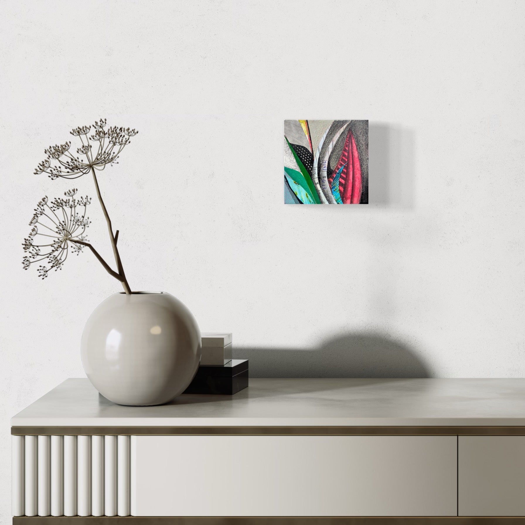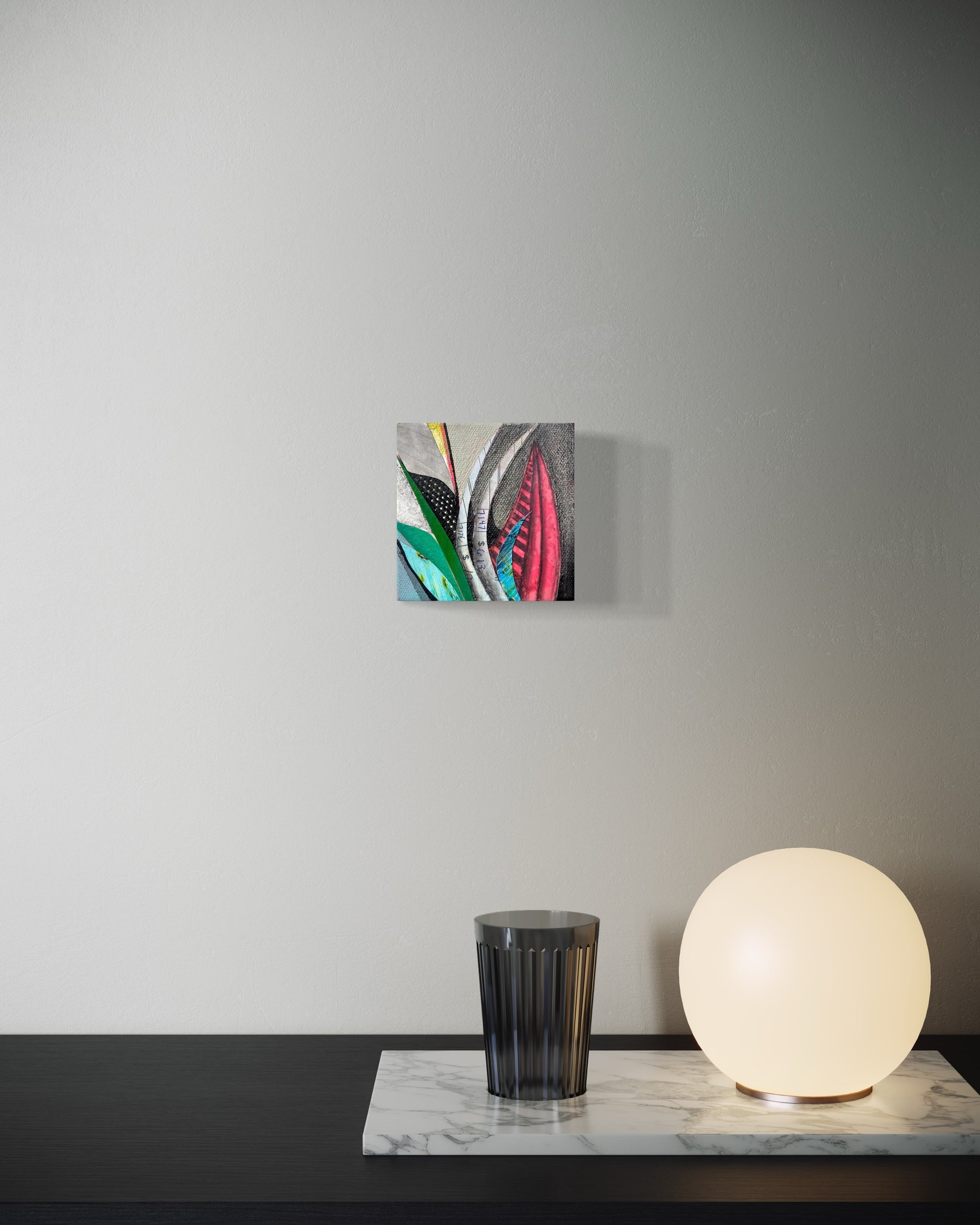 Medium: Acrylic, plastic netting, fabric, paper, oil pastel, and resin on canvas.