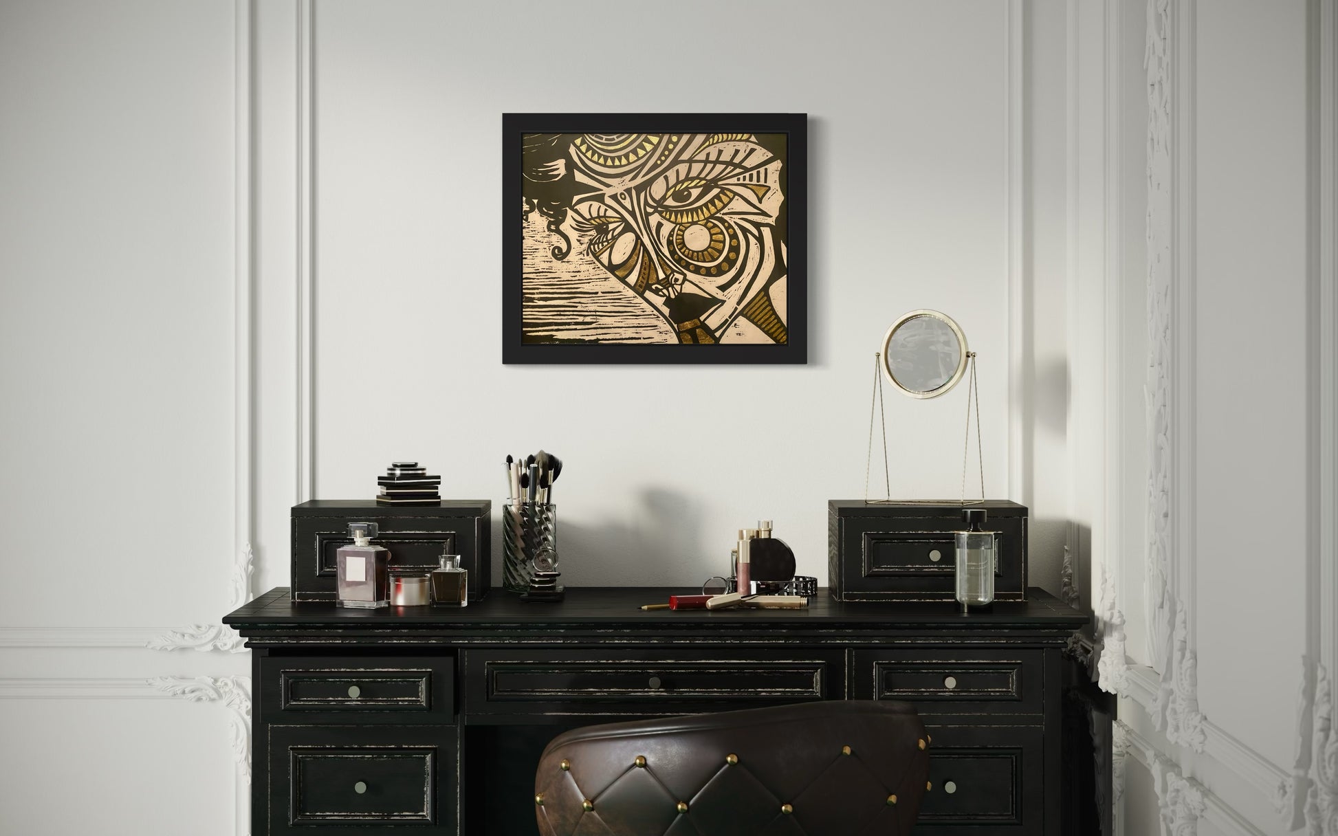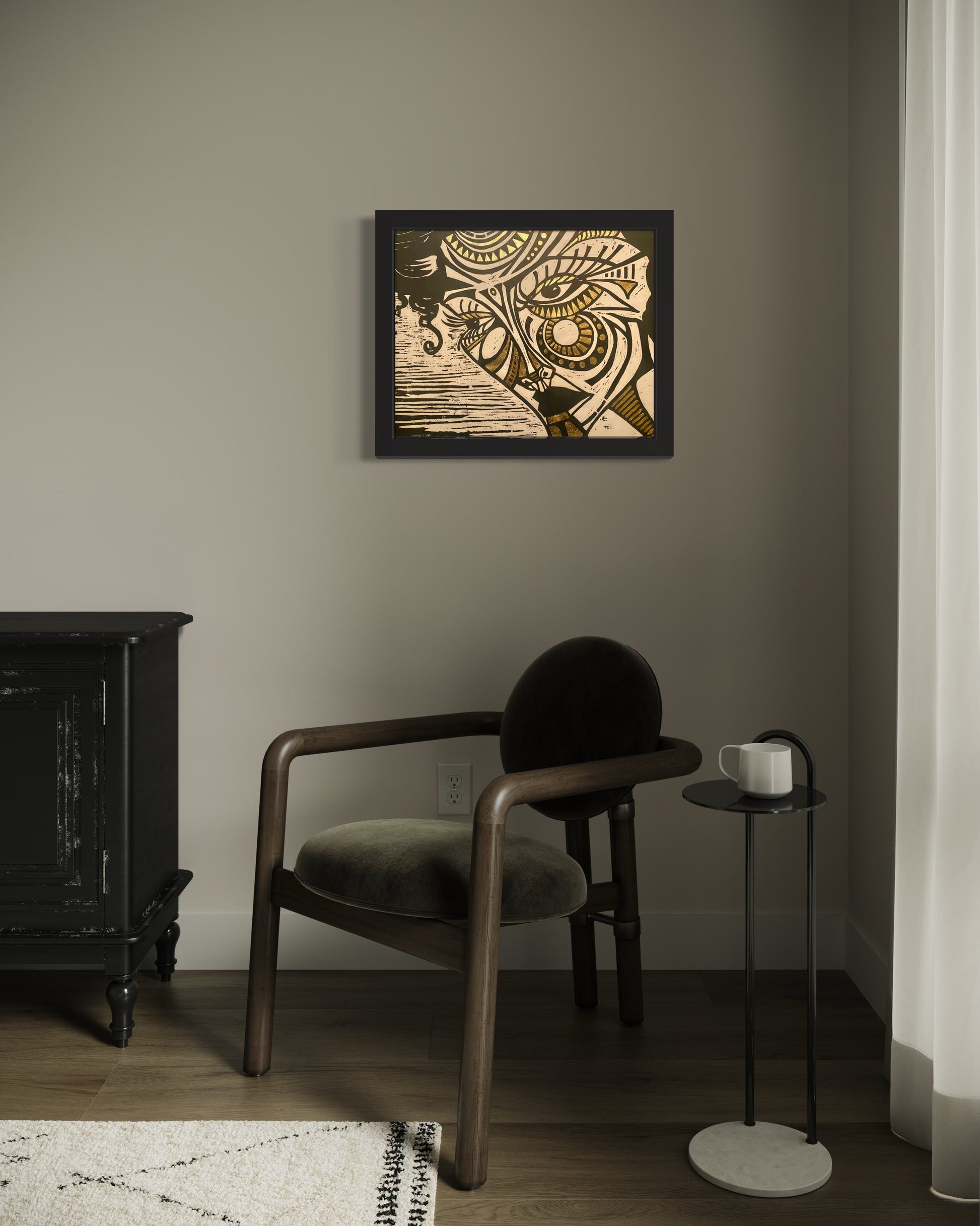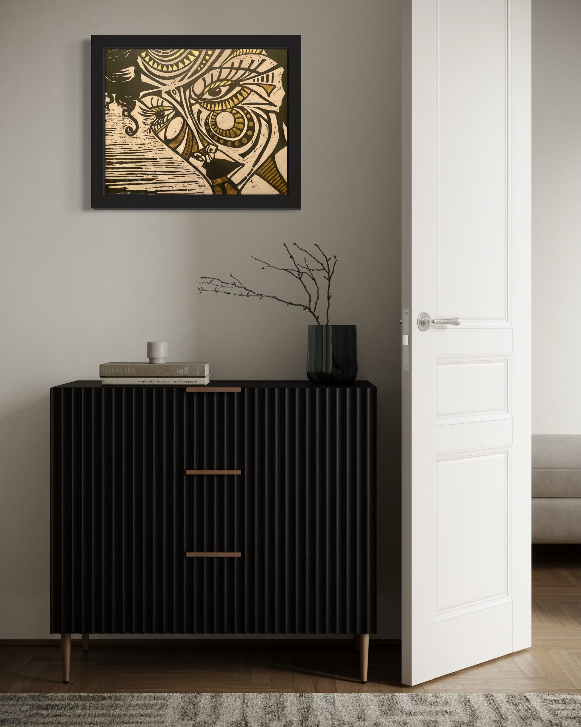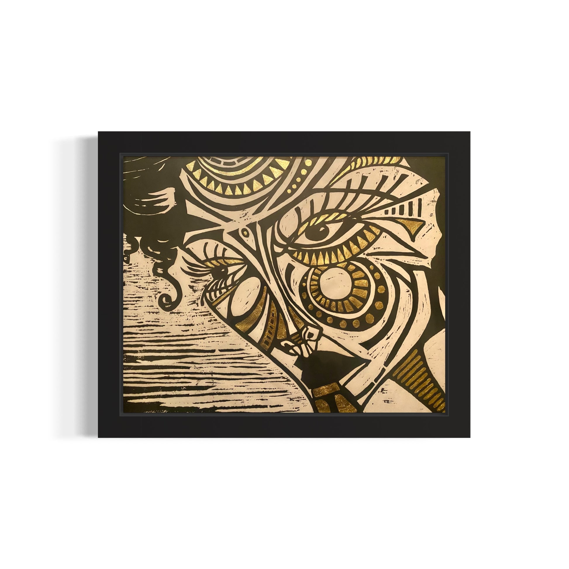 Ruby 1/1 Original Black Ink Woodblock Print with gold leaf accent.