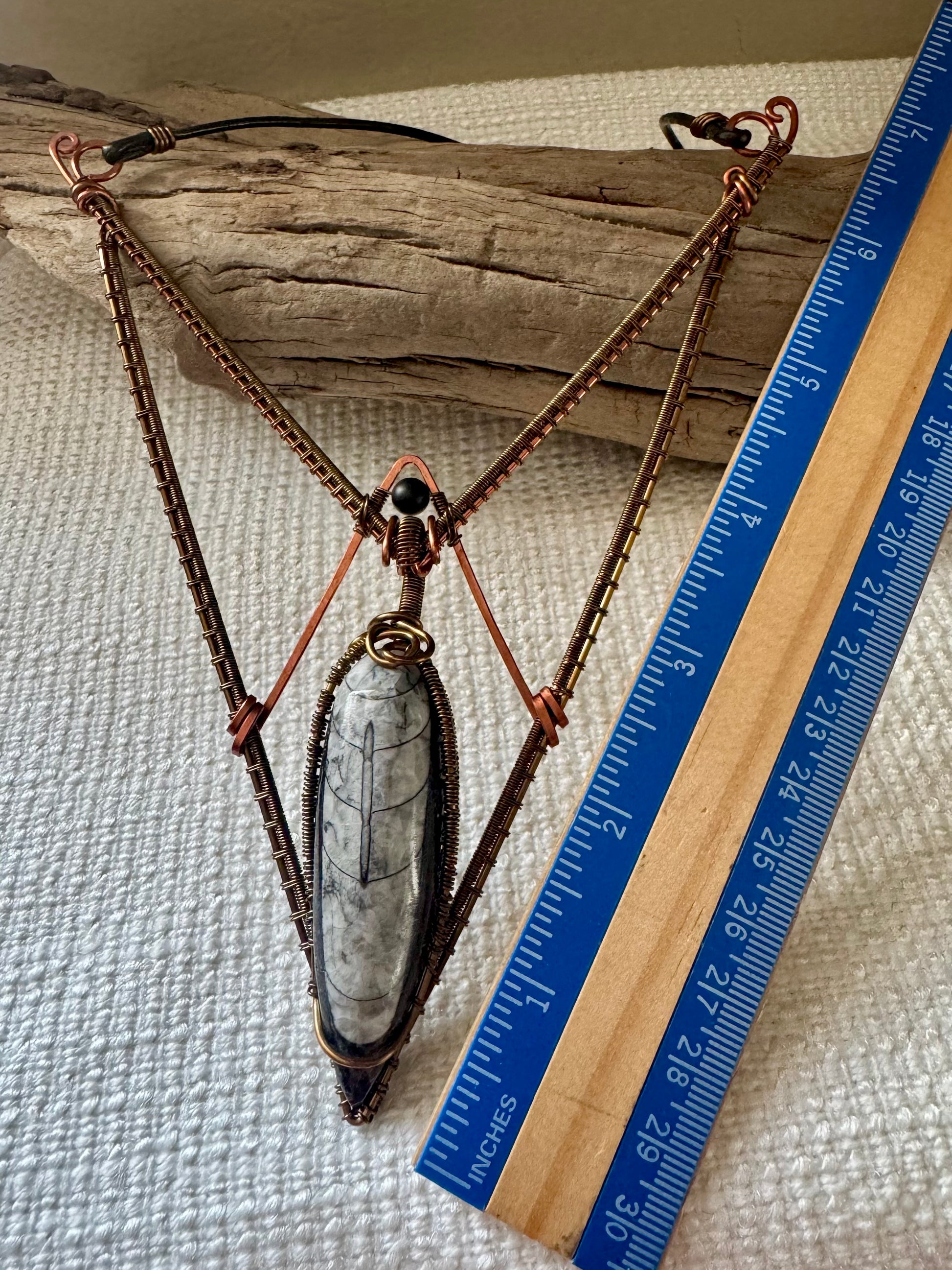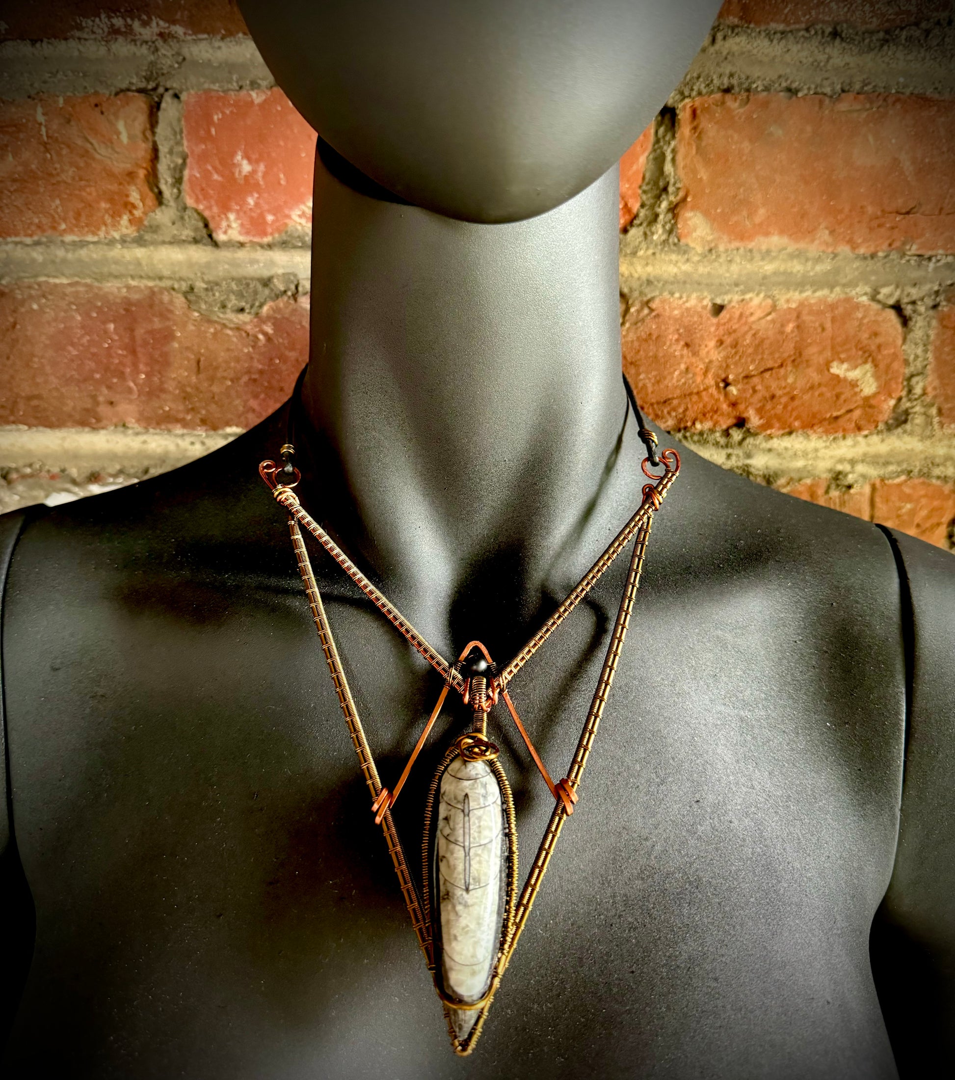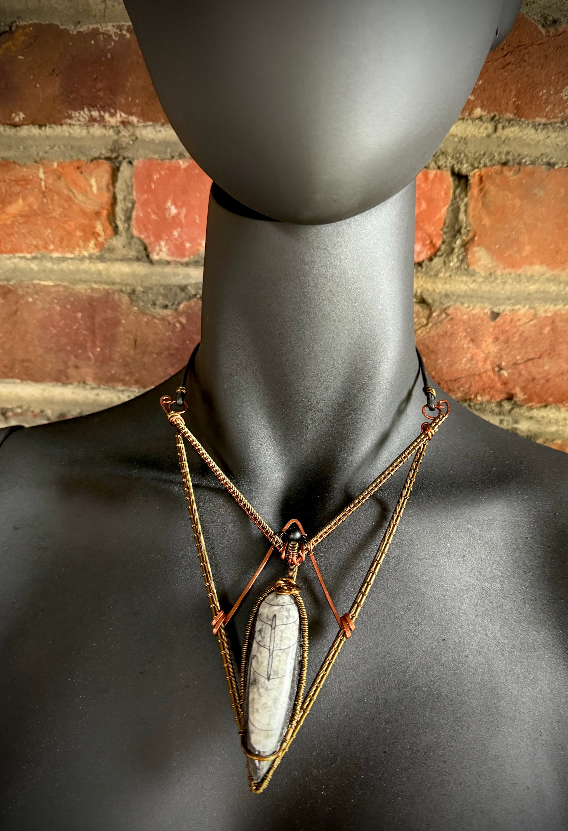 Symmetrical Orthoceras fossil statement necklace wire wrapped with antique bronze and copper.