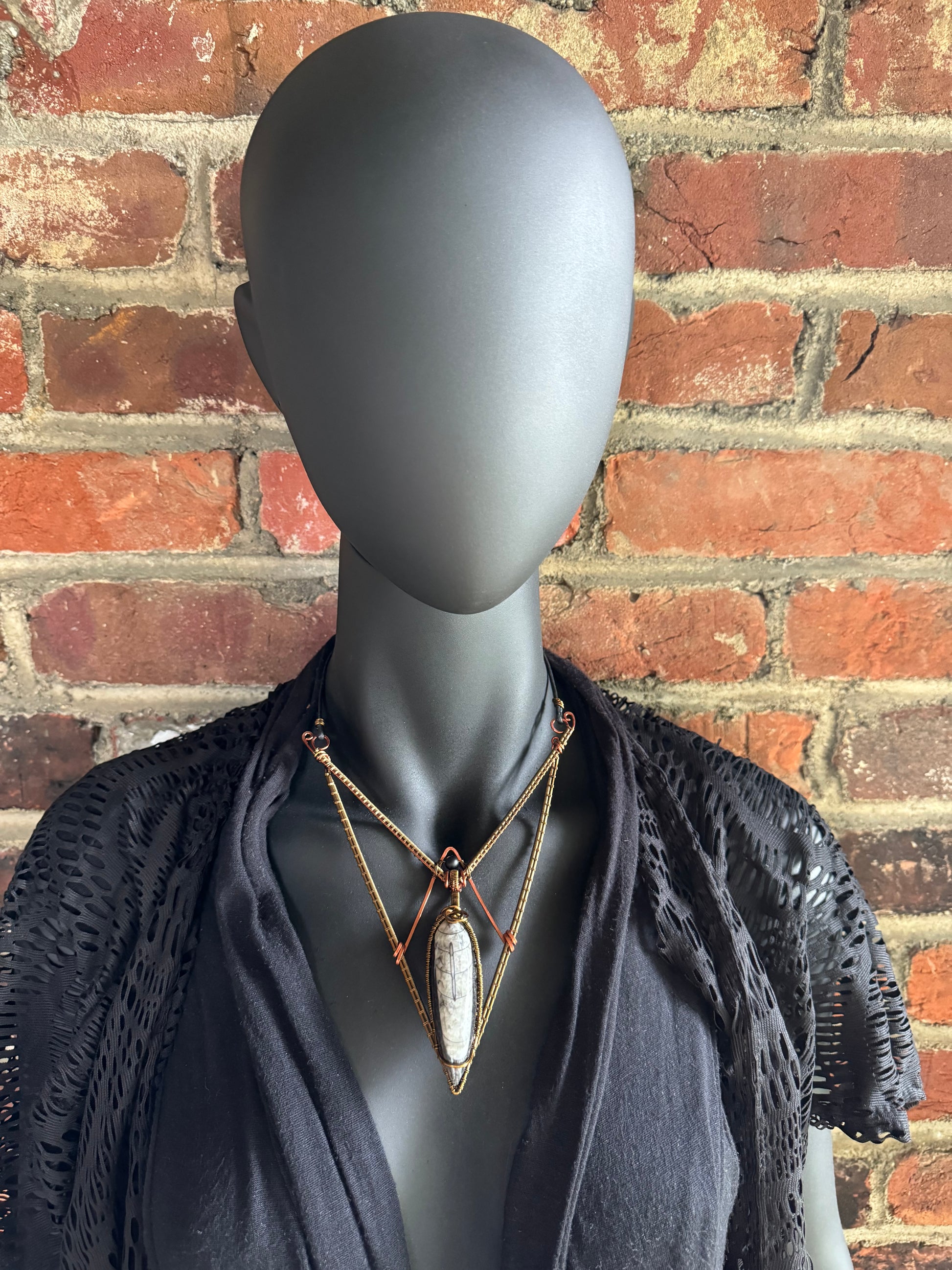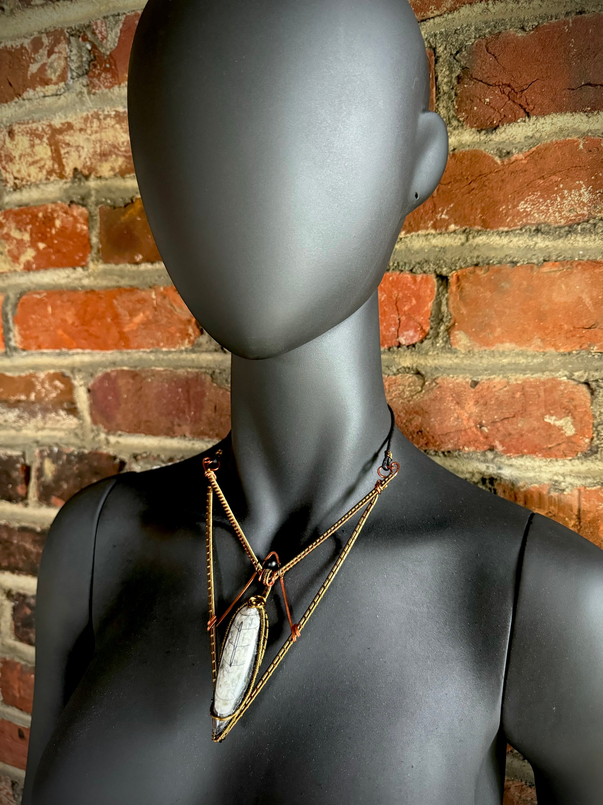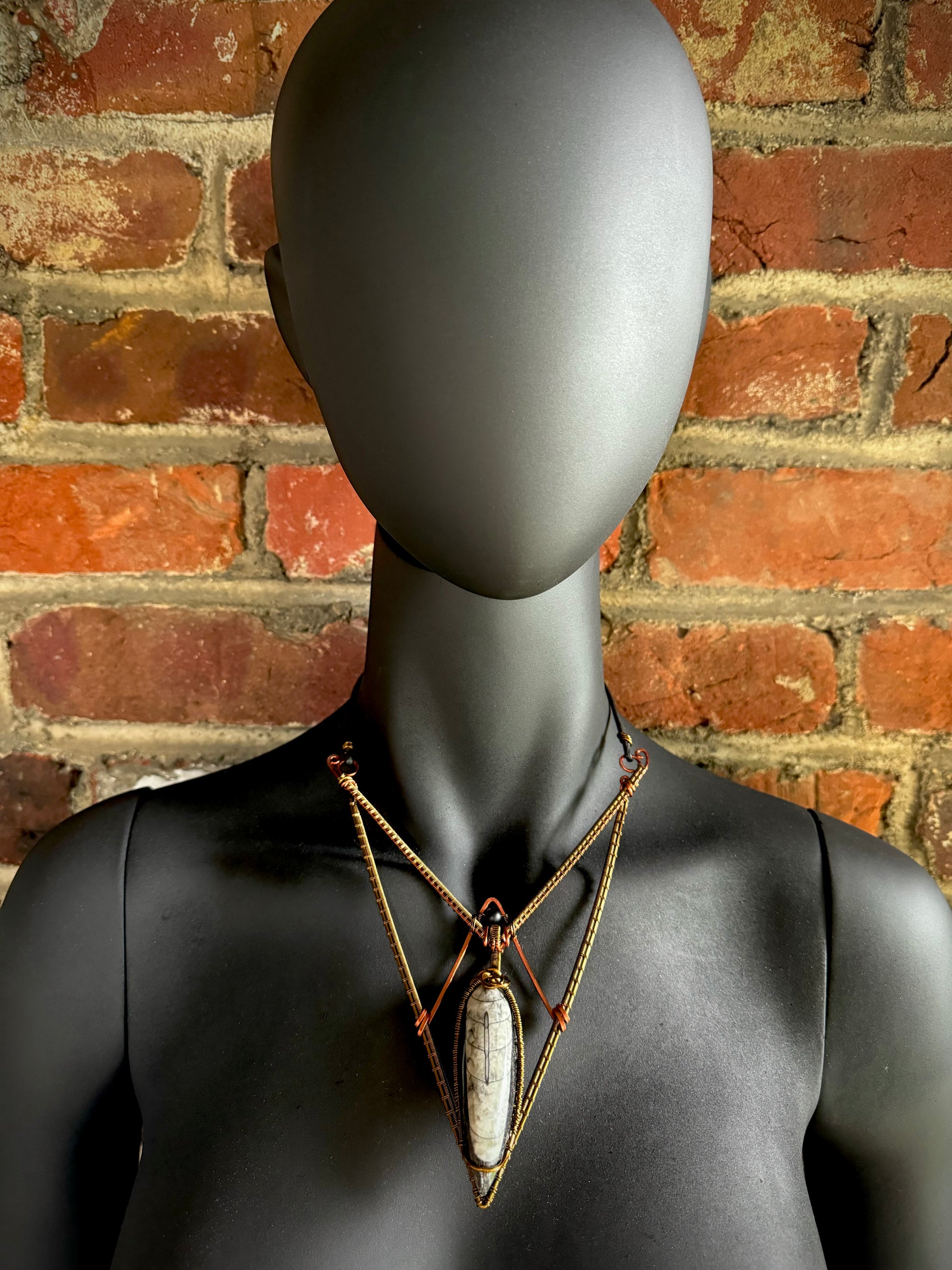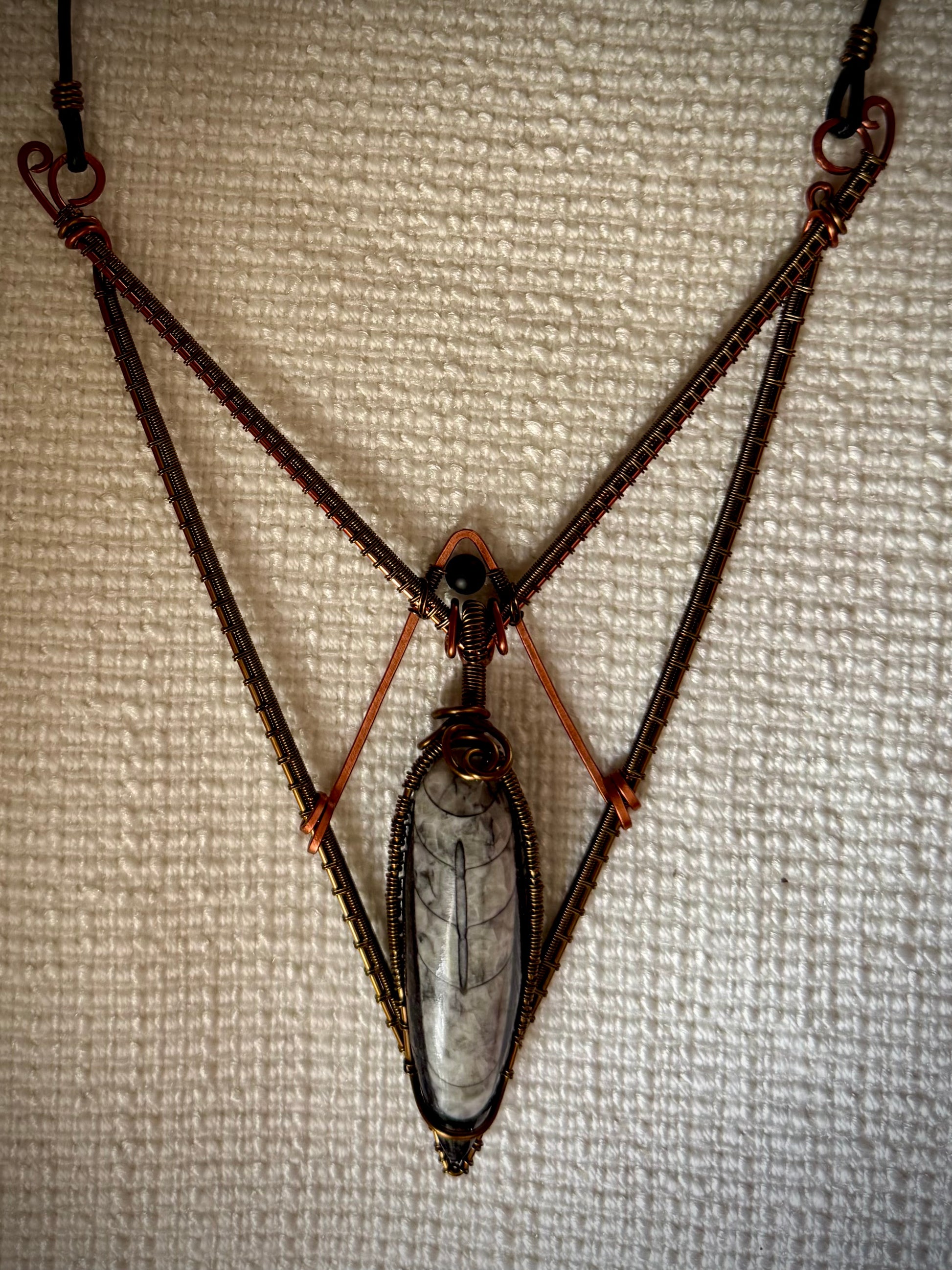 Symmetrical Orthoceras fossil statement necklace wire wrapped with antique bronze and copper.