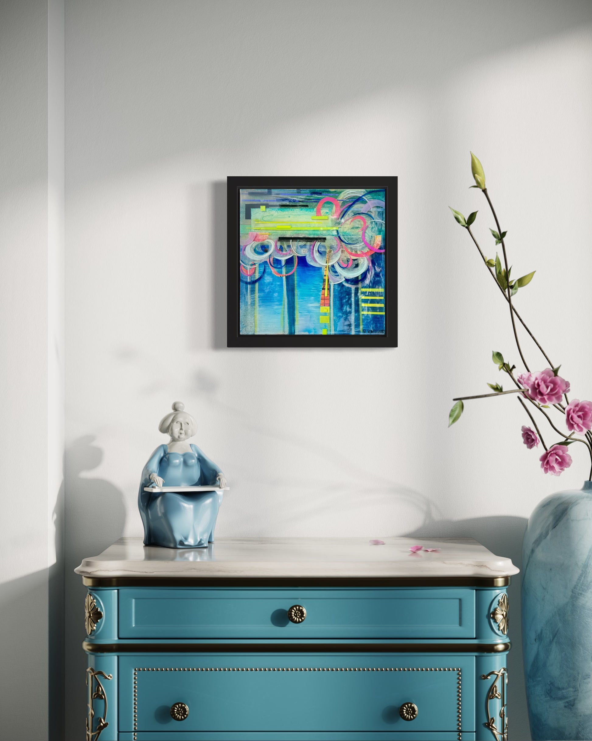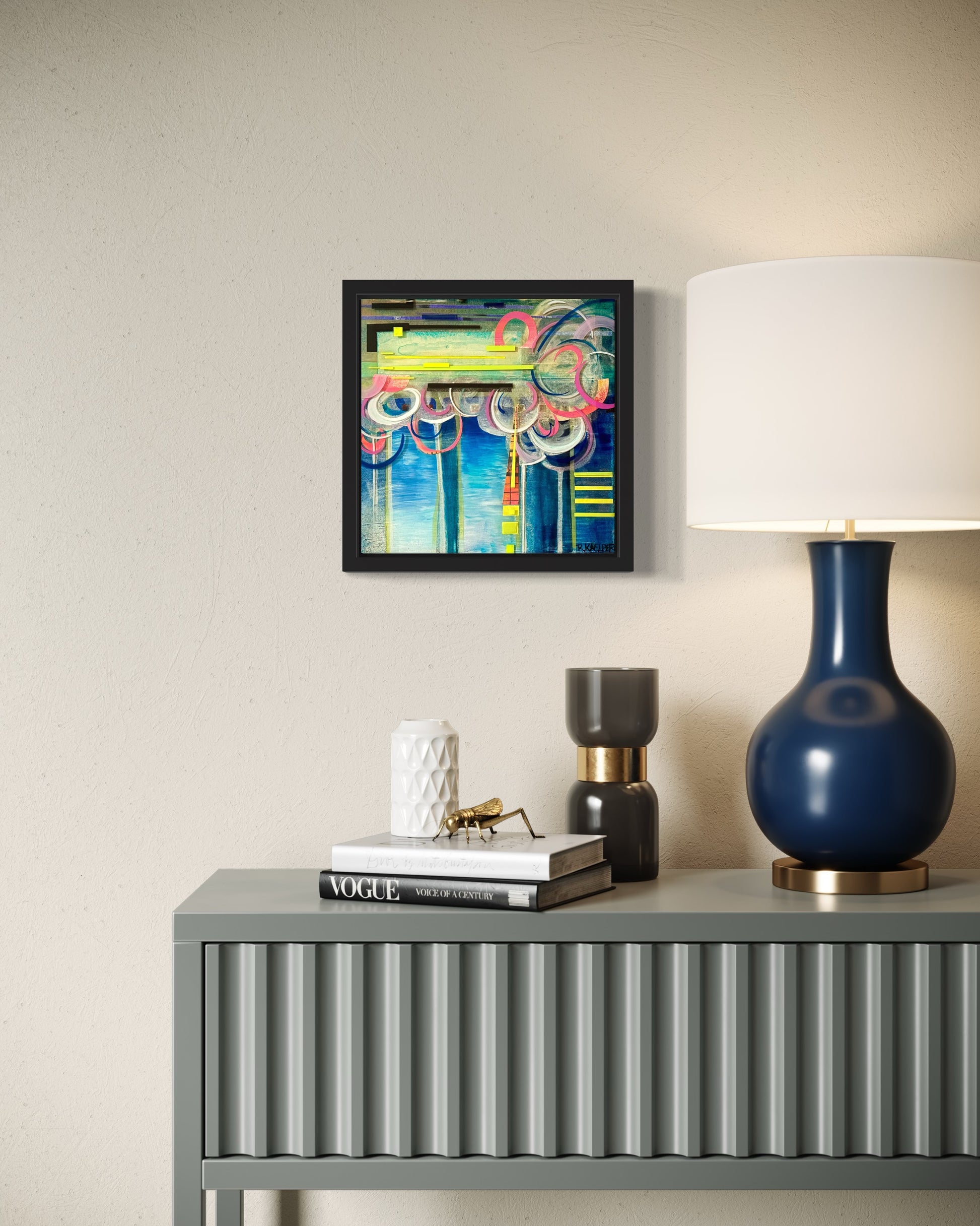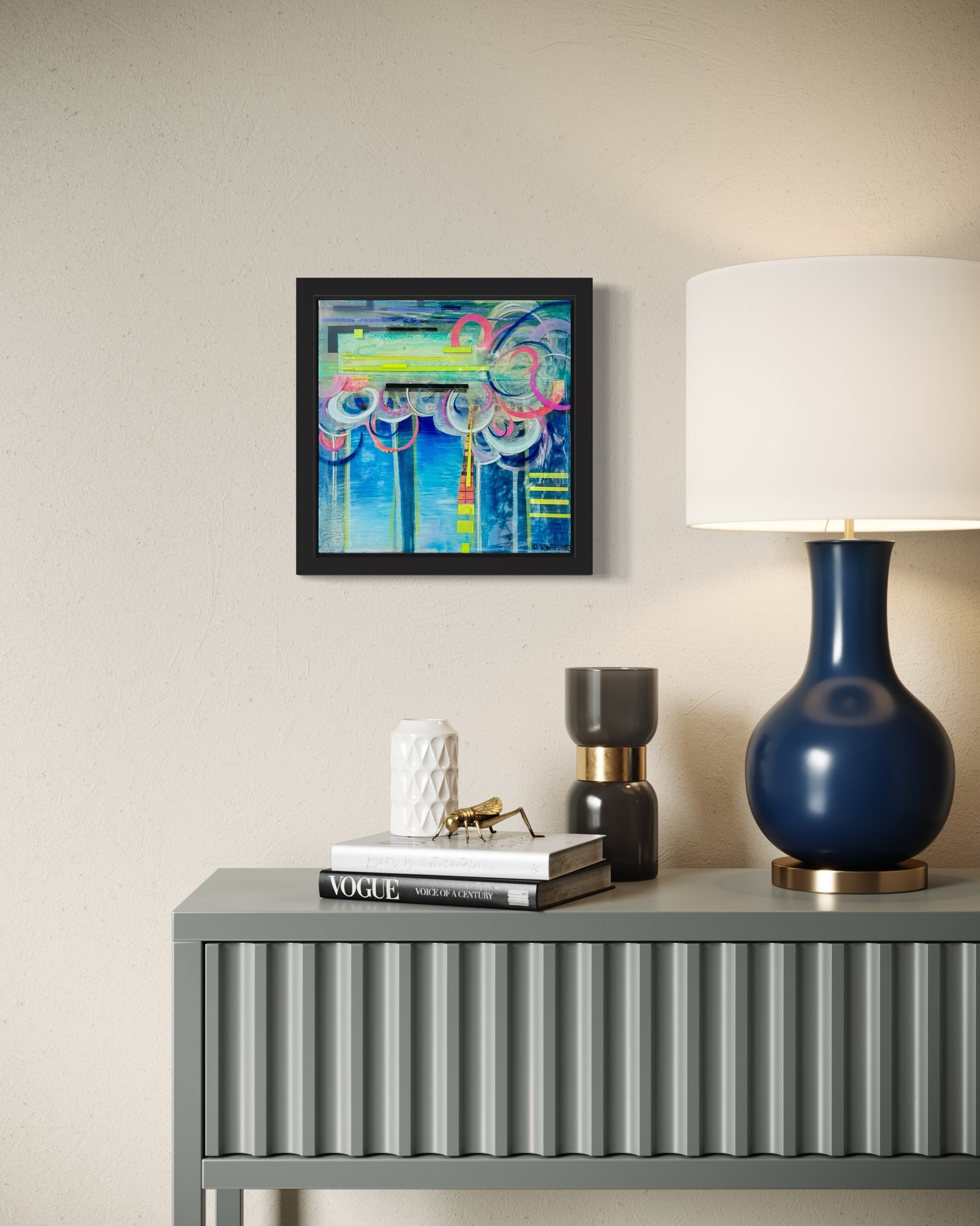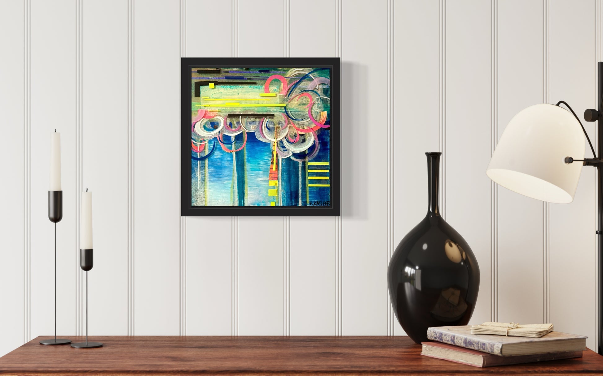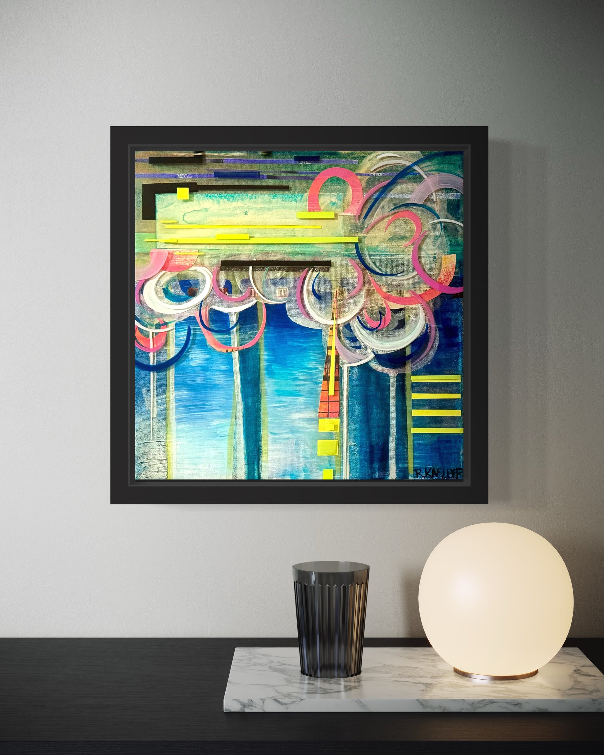 Medium: Acrylic, ink, oil pastel, paper, and resin on stretched canvas.