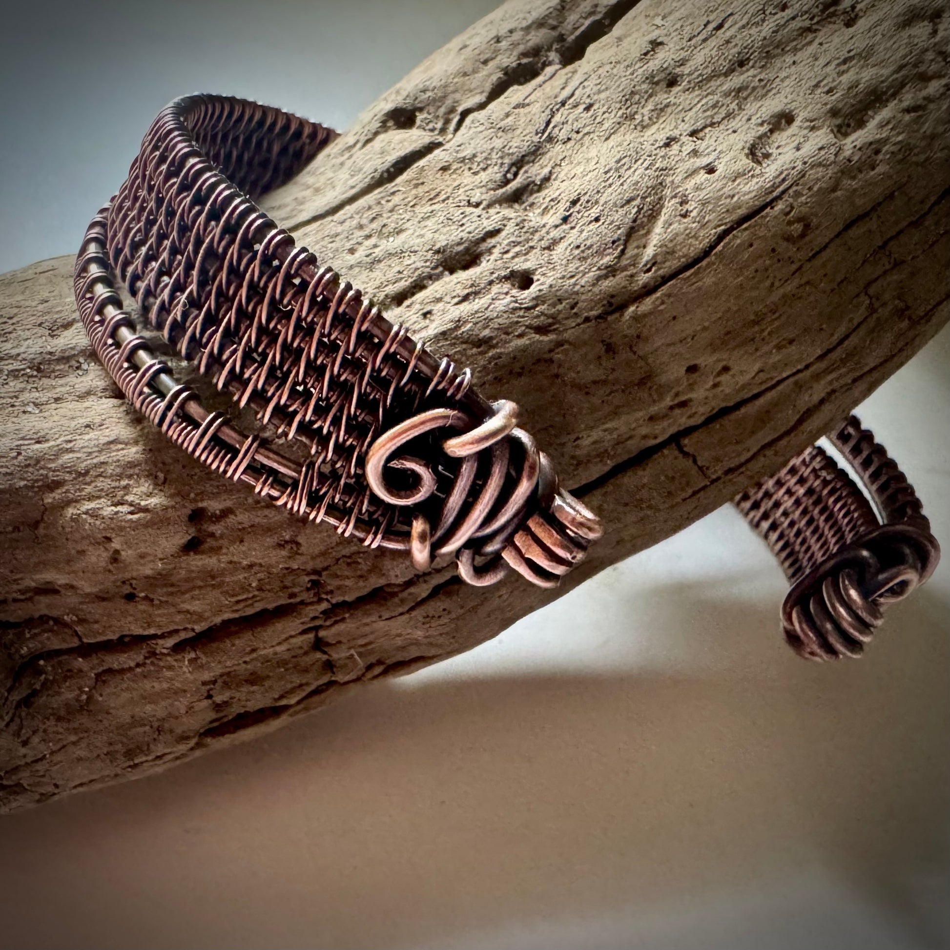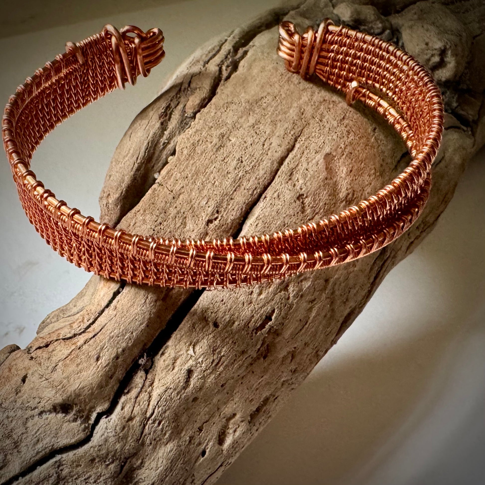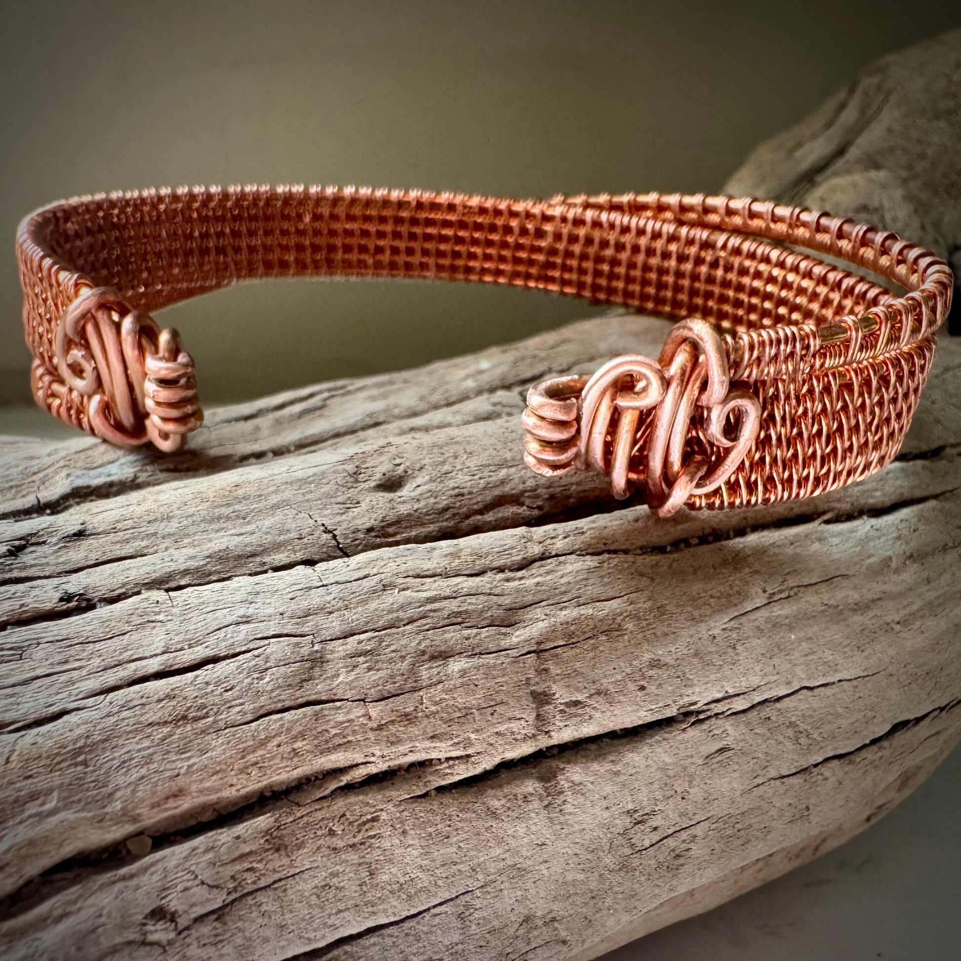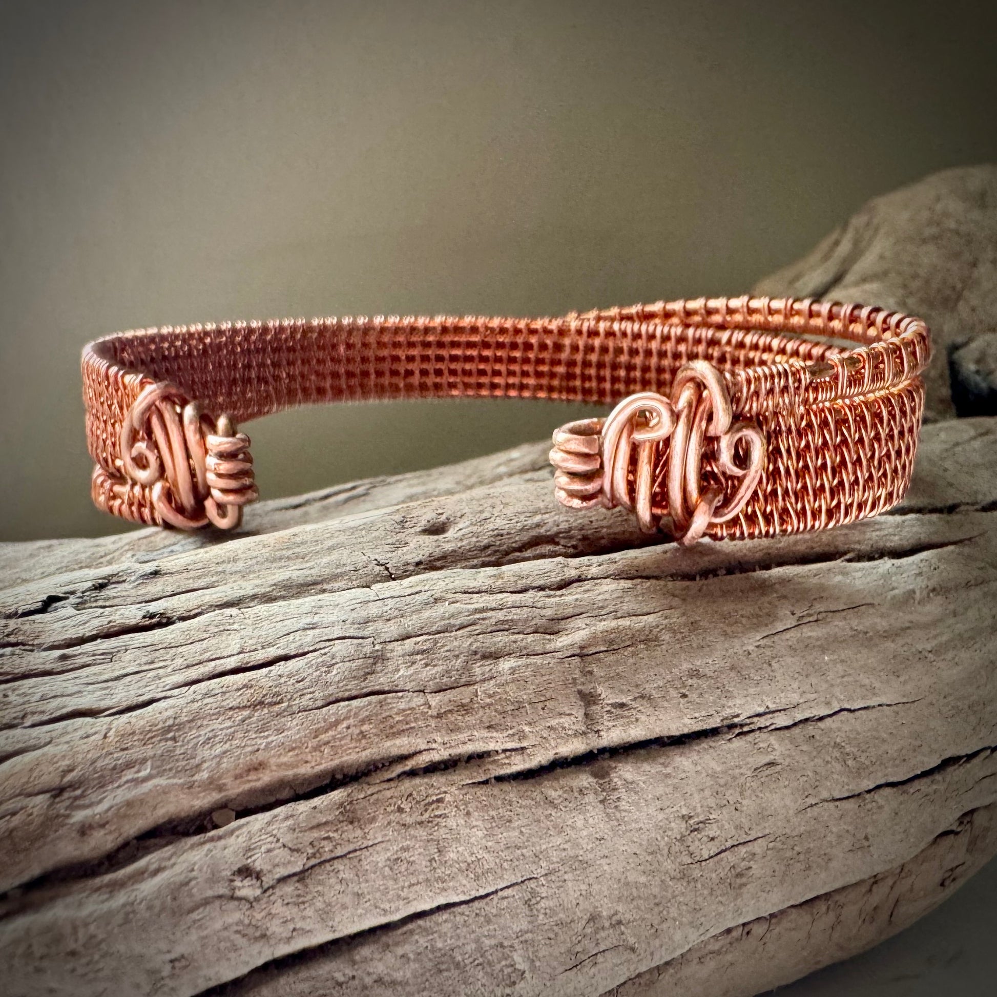 Made to Order. Created with wire wrapping techniques, this Twisting Copper Cuff provides an attractive accessory with additional benefits. Copper is known to reduce inflammation and release tension and frustration, as well as enhancing brain function. Treat yourself to this unique and stylish accessory and gain the benefits of copper.