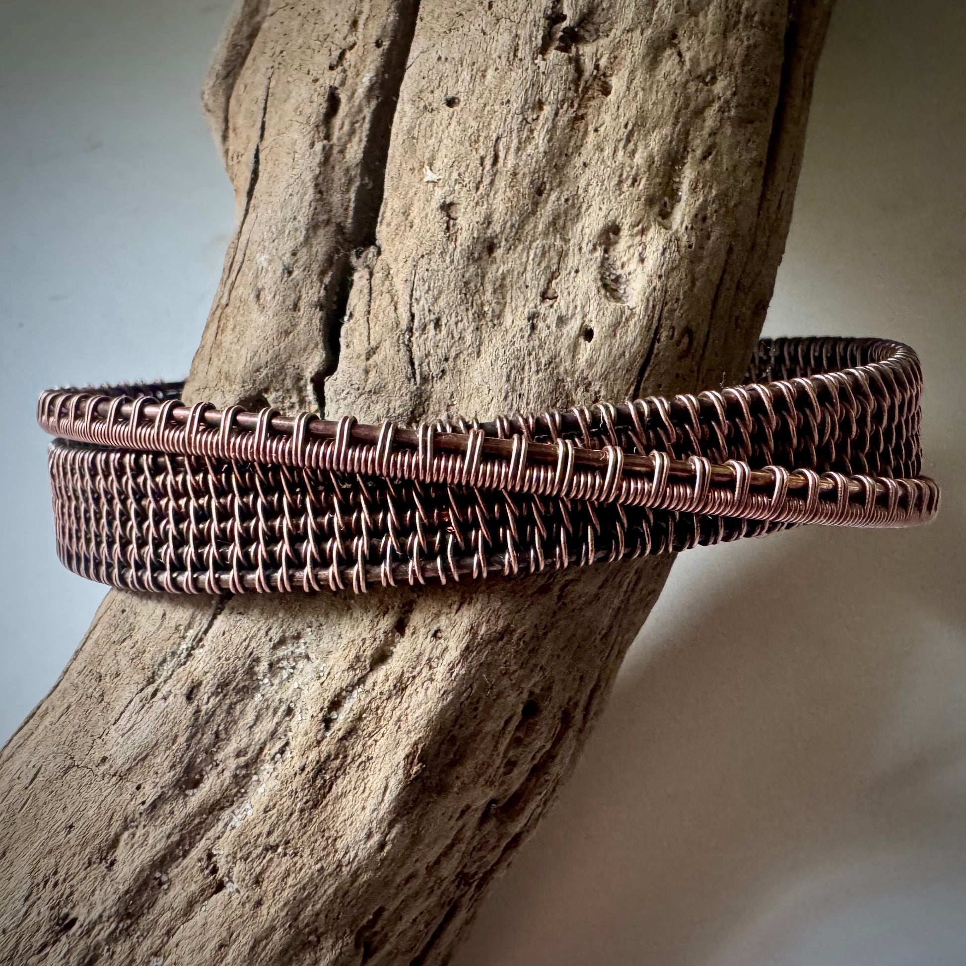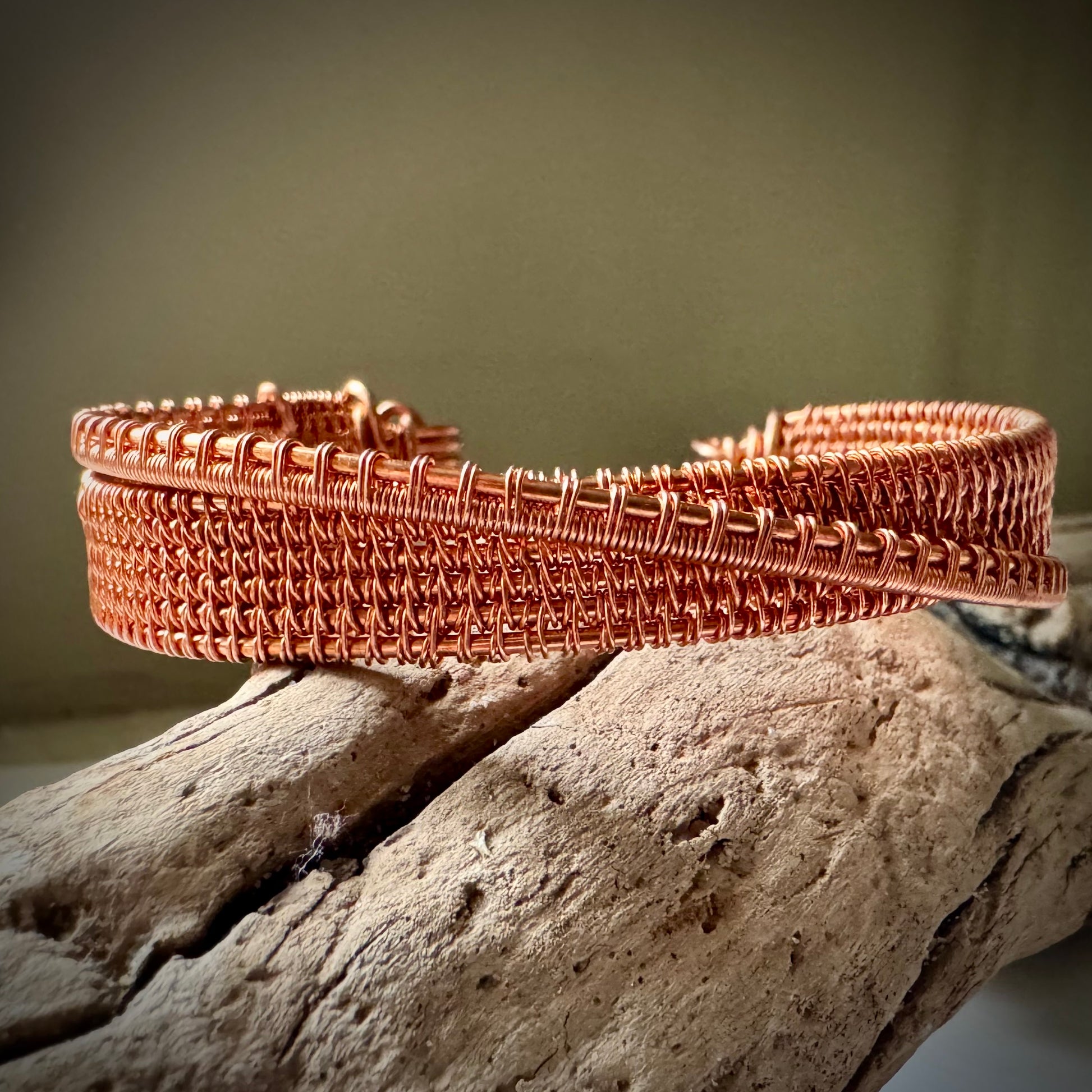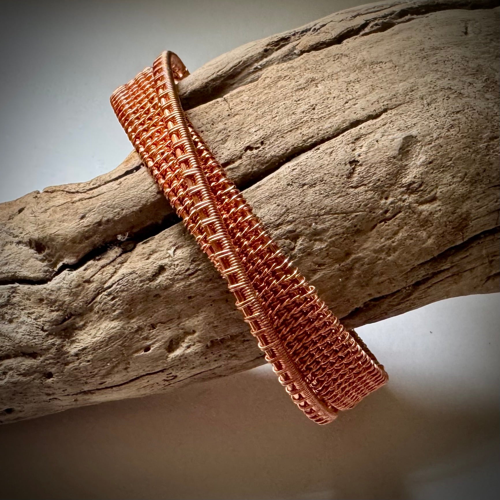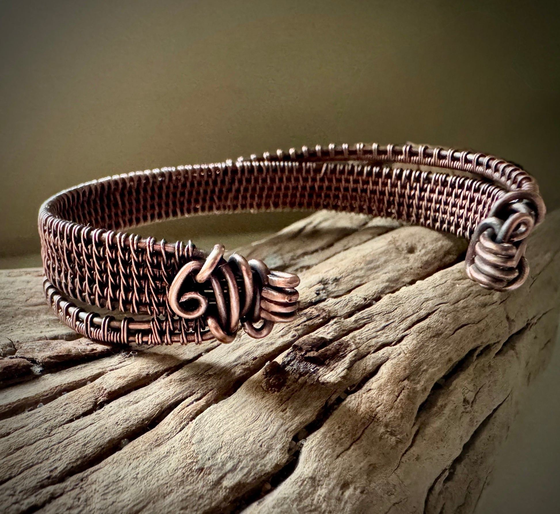 Made to Order. Created with wire wrapping techniques, this Twisting Copper Cuff provides an attractive accessory with additional benefits. Copper is known to reduce inflammation and release tension and frustration, as well as enhancing brain function. Treat yourself to this unique and stylish accessory and gain the benefits of copper.