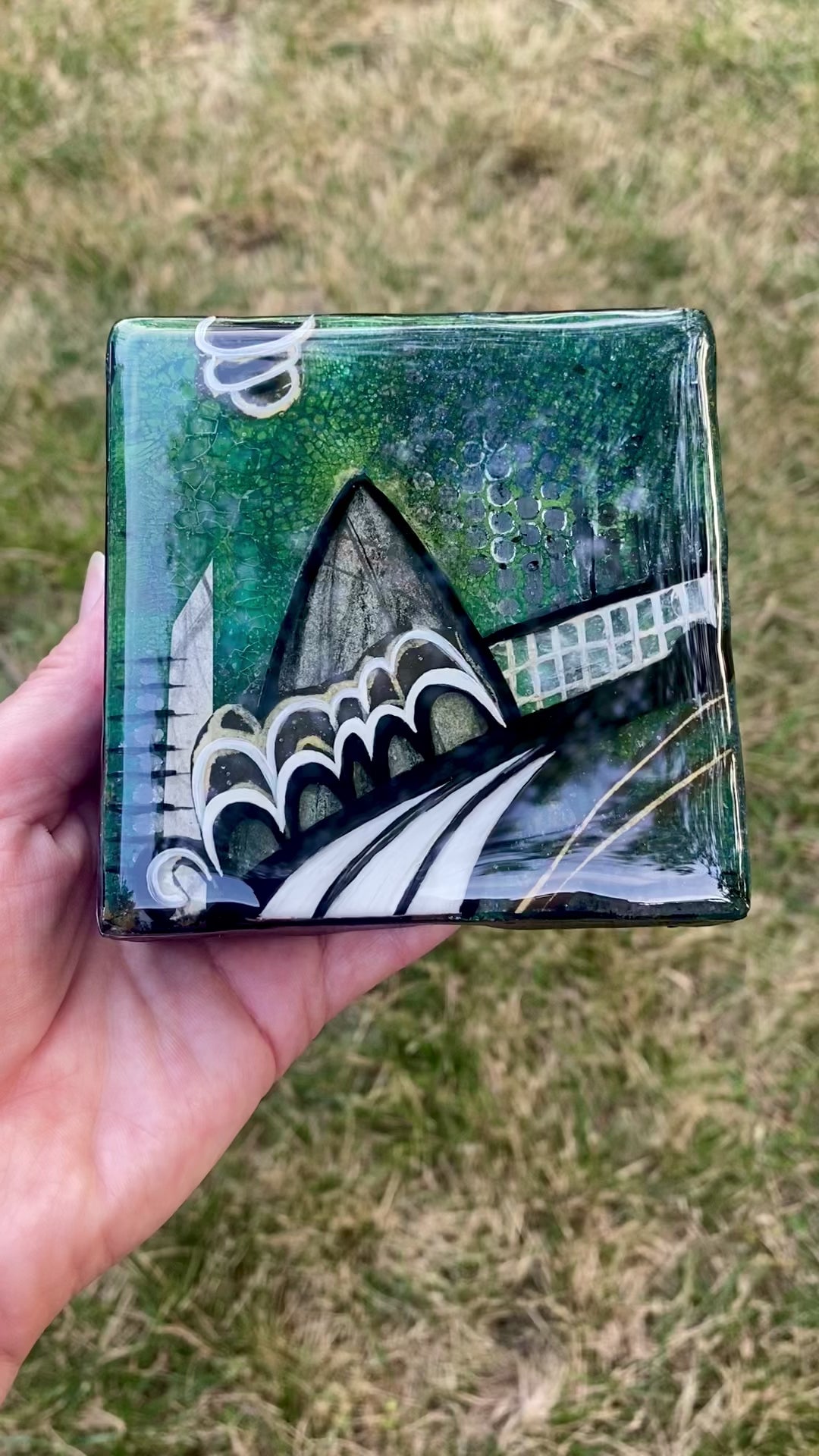 Medium: Acrylic, paper, ink, graphite, oil pastel, plastic netting, and resin on stretched canvas.