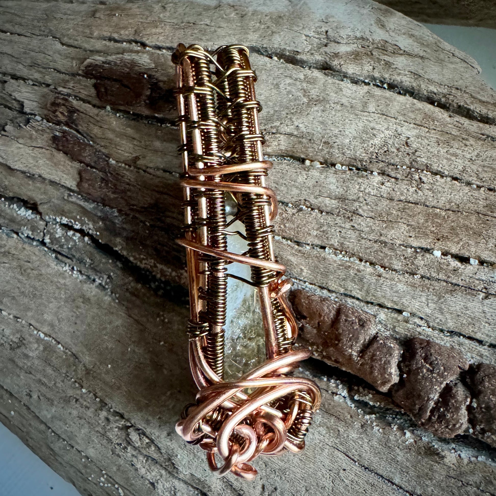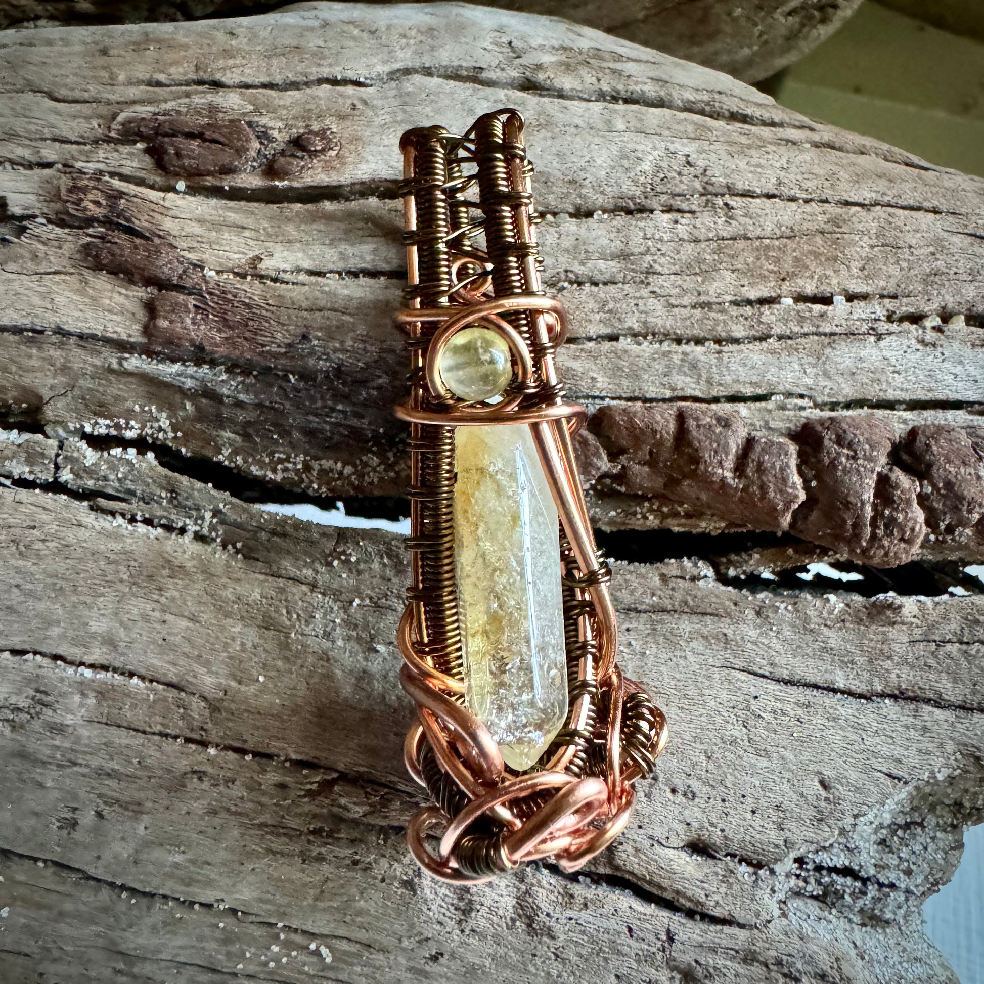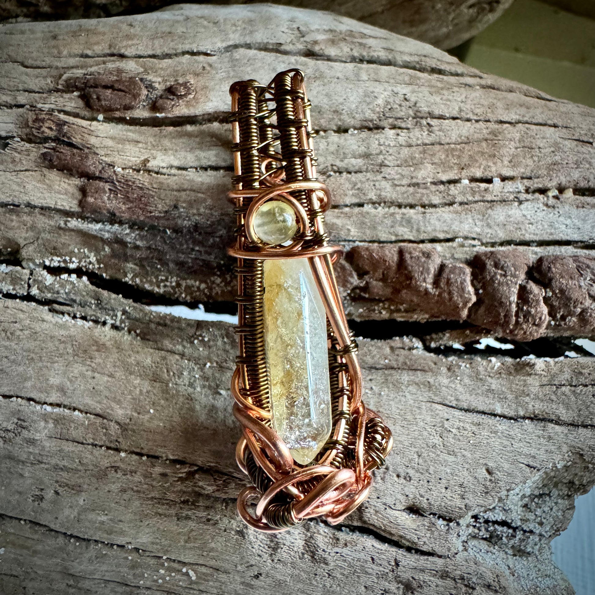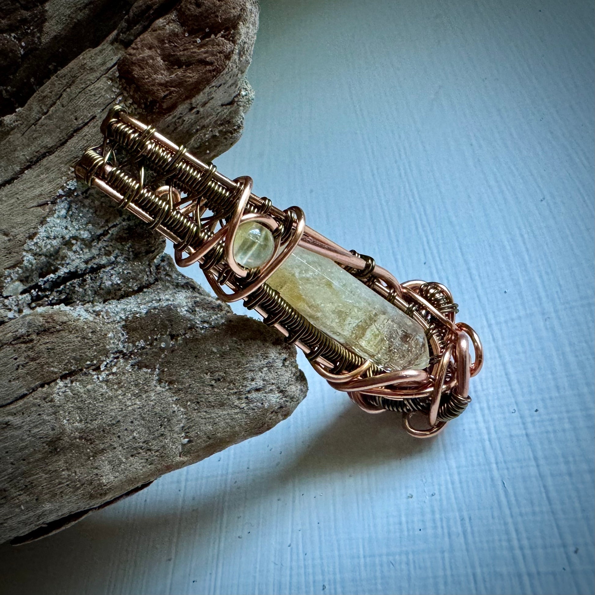 Prehnite and Citrine Pendant Wrapped in Antique Copper and Bronze